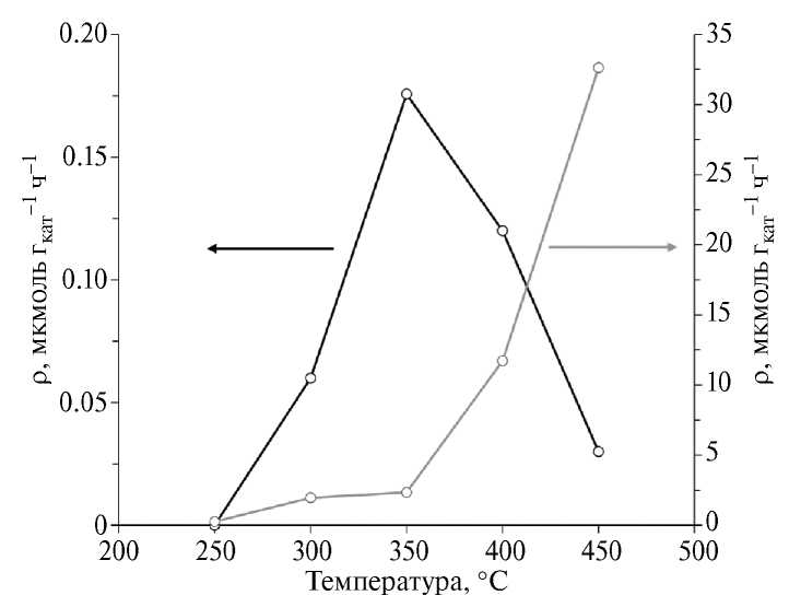 Исследование активности катализатора окислительного карбонилирования метана проводили в широком интервале температур с использованием сухой и влажной смесей [33]. Как видно из рис. 3, повышение температуры до 350°С способствует монотонному росту удельной производительности по УК до 0.18 мкмоль гкат–1·ч–1. Последующее увеличение температуры до 450°С сопровождается понижением выхода целевого продукта до 0.3 мкмоль гкат–1·ч–1 вследствие ускорения вторичных превращений УК, приводящих к образованию полициклических ароматических соединений, являющихся предшественниками кокса [34]. Напротив, при добавлении в исходную смесь воды выход УК резко возрастает. В интервале температур 250–450°С удельная производительность увеличивается от 0.3 до 32.6 мкмоль гкат–1·ч–1. Конверсия воды варьируется в диапазоне 5–10%. Повышение удельной производительности по УК (на 2 порядка) при подаче влажной смеси объясняется тем, что присутствие водяного пара ускоряет хемодесорбцию УК через гидролиз ацильного интермедиата, что согласуется с экспериментальными [6, 35] и расчетными данными [36].