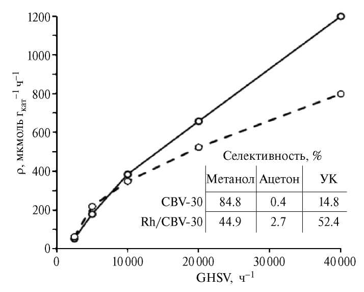 Было исследовано влияние родия на каталитические свойства цеолита CBV30. Результаты представлены на рис. 5. Эксперименты проводили при 450°С и 6.5 МПа в условиях повышенных скоростей подачи смеси (GHSV = 2500–40000 ч–1). Повышение GHSV от 2500 до 40000 ч–1 приводит к многократному увеличению удельной производительности по УК на обоих каталитических системах. Следует отметить, что существенная разница каталитической активности между Rh/CBV30 и CBV30 наблюдается только при GHSV, превышающей 10000 ч–1. При 40000 ч–1 удельная производительность на Rh/CBV30 составляет 1198 мкмоль гкат–1 ч–1, на CBV30 – 798 мкмоль гкат–1 ч–1, что значительно превышает аналогичные показатели в ряде работ [8, 36, 39]. Кроме того, введение родия в цеолит CBV30 в количестве 0.5 мас.% приводит к значительному увеличению селективности образования УК. При 40000 ч–1 селективность по УК в присутствии образца Rh/CBV30 достигает 52.4%, в то время как на немодифицированном образце значение селективности составляет 14.8% [40].