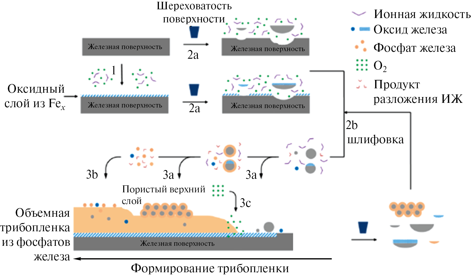 Что касается базового масла, в работе [34] представлен механизм конкурентной адсорбции между ИЖ и базовыми маслами на поверхности металла. В начале испытания на трение стальная поверхность была почти полностью покрыта полярными функциональными группами молекул базового масла. По мере продолжения испытания с поверхности стали высвобождались электроны. Это способствовало адсорбции ИЖ с последующим образованием пленки, причем чем меньше было ИЖ (около 1 мас.%), тем более эффективно ИЖ адсорбировалась на поверхности.