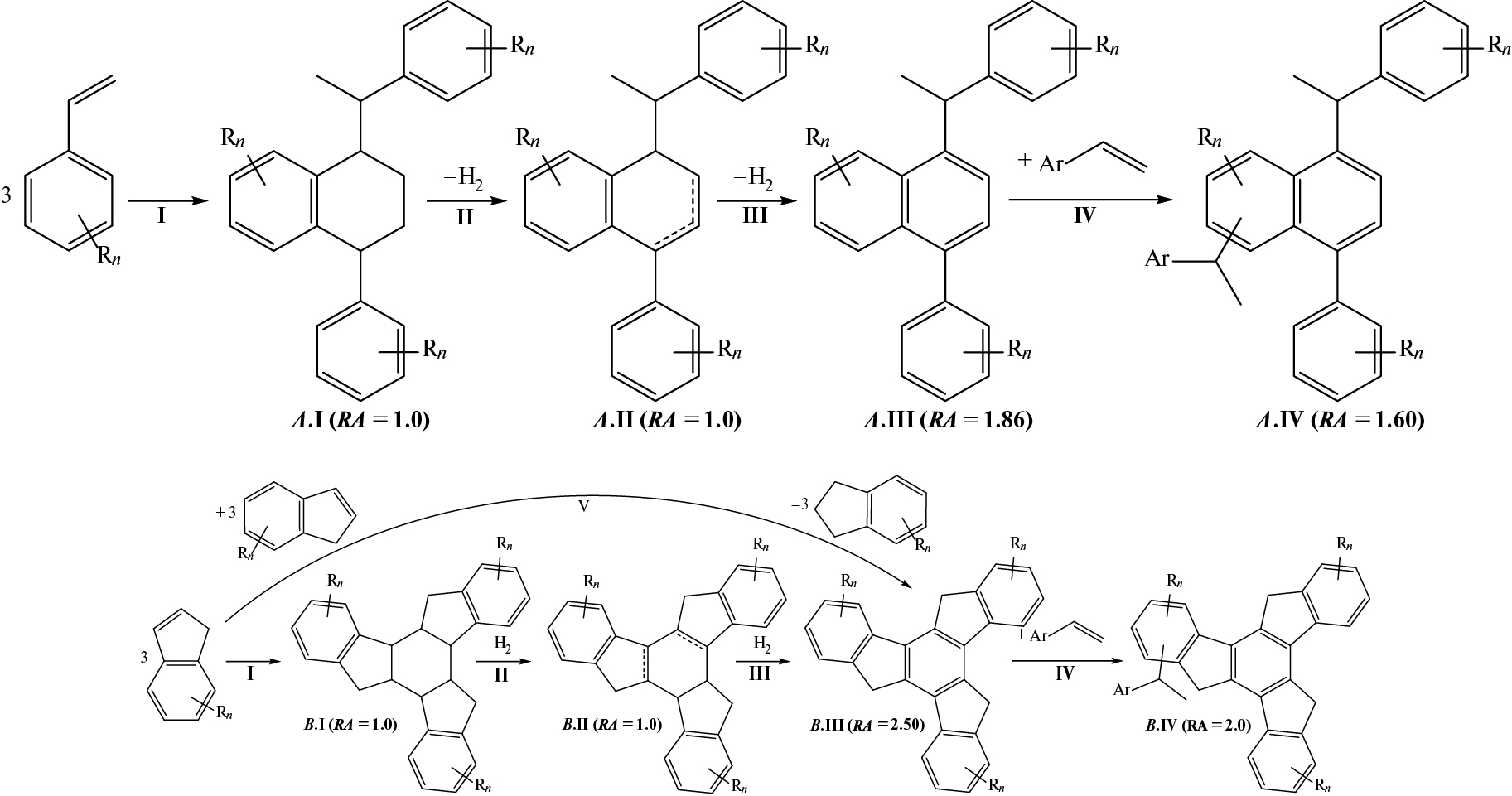 В процессе термической обработки ТСП при 260оС протекают реакции тримеризации мономеров (стадия I) и диспропорционирования циклоолефинов, образовавшихся по реакции II при пиролизе, с одновременным получением продуктов стадий I и III. Также в некоторой степени идет алкилирование ароматических ядер гомологами стирола (стадия IV), чем объясняется появление пятикольчатых аренов среди молекул мальтенов. В то же время новые циклоолефиновые структуры типа A.II, B.II не формируются из-за термодинамической невозможности стадии II. Так, например, свободная энергия Гиббса реакции дегидрирования тетралина в 1,2-дигидронафталин принимает отрицательные значения при температурах выше 600°C. Из-за того, что не образуются предшественники конденсированных полиаренов, следовало бы ожидать уменьшения степени конденсированности мальтенов после термообработки ТСП. Однако, согласно табл. 5, значение параметра RA у мальтенов, выделенных из НПС, выше, чем у мальтенов вакуумного остатка ТСП. Это можно объяснить прямым образованием гомологов труксена типа B.III по реакции V (рис. 6), когда тримеризация производных индена сопровождается перераспределением водорода с одновременным получением гомологов индана.