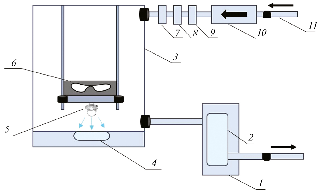 Рис. 1. Схема стенда для измерения фотокаталитической активности: 1 — ИК-Фурье спектрометр, 2 — газовая кювета, 3 — фотореактор, 4 — фотокатализатор, 5 — УФ-светодиод, 6 — вентилятор, 7 — раствор хлорида лития, 8 — раствор NaOHконц, 9 — угольный фильтр, 10 — насос, 11 — вход воздуха.