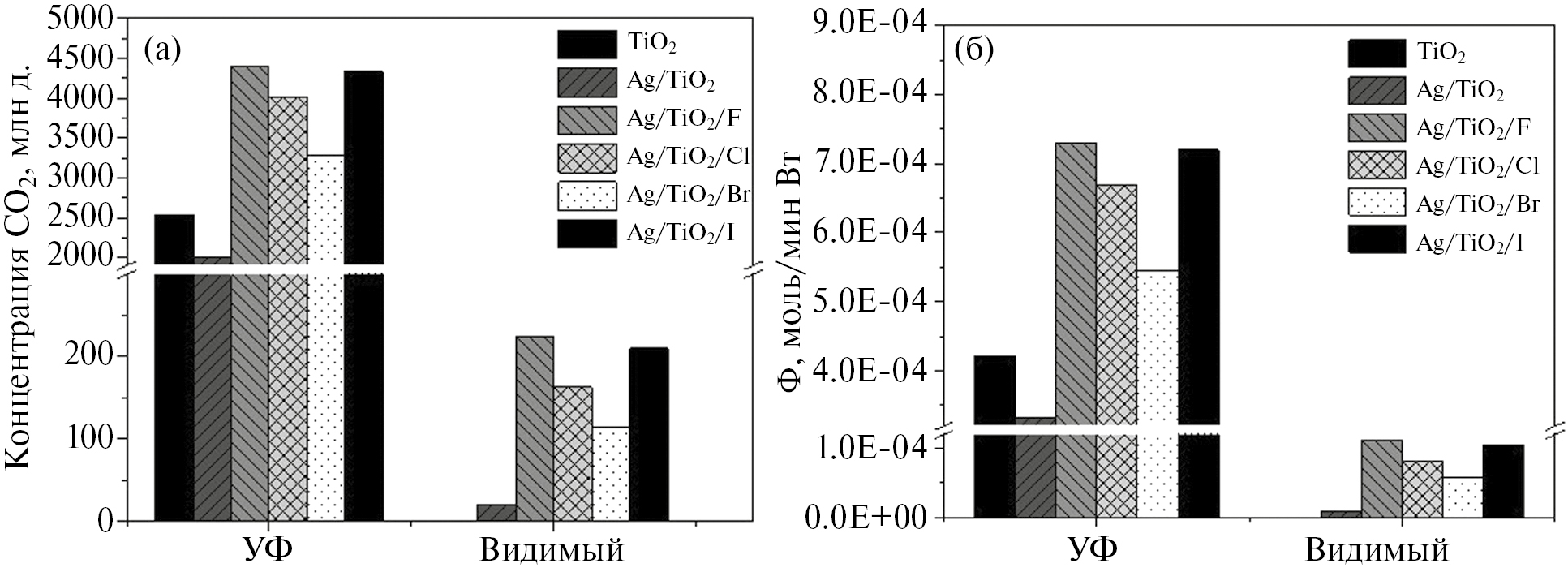 Исследование каталитической активности показало, что при окислении при УФ-воздействии концентрация получаемого углекислого газа составляет от 2000 млн долей для образца Ag/TiO2 до 4396 млн долей для образца Ag/TiO2/F (рис. 2а). Данный положительный эффект в первую очередь может быть связан как с образованием наноразмерных частиц серебра, так и изменением сорбционных свойств вследствие наличия на поверхности связей Ti–Hal. Так, фторид анион способствует сорбции молекул воды на поверхности диоксиде титана [26], окисляющейся, в свою очередь, на ней с образованием –OH, который уже участвует в окислении ацетона.