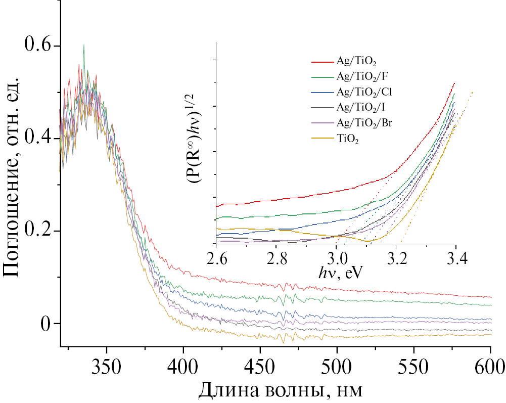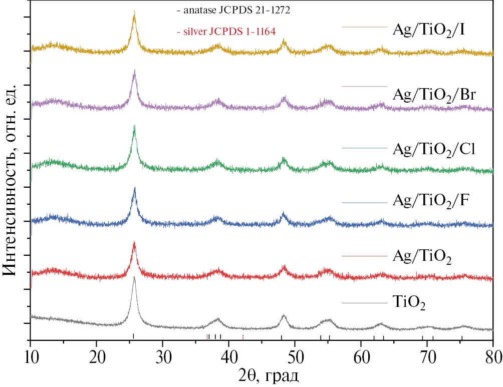Нанокристаллический диоксид титана и созданные на его основе материалы широко используются в качестве катализаторов для фотокаталитической очистки воды и воздуха, а также являются составляющими фотоэлектрохимических устройств, преобразующих солнечную энергию в ячейках Гретцеля [1, 2]. Эффективность подобных материалов на основе диоксида титана может сильно варьироваться и зависит от их морфологии, а также присутствия на поверхности TiO2 различных ионов и допантов. Так, модификация поверхности различными анионами может как увеличивать фотокаталитическую активность в случае нитрат анионов [3, 4], так и уменьшать в случае сорбированных на поверхности сульфат анионов [3]. Отдельное внимание заслуживает модификация поверхности диоксида титана галогенид-анионами. Ряд исследователей показали, что фторирование поверхности диоксида титана оказывает положительное влияние на его фотокаталитические свойства [5, 6]. Высокая фотоактивность таких катализаторов связана с множеством факторов: это и образование кристаллов TiO2 в форме усеченного октаэдра с доступными высокоэнергетическими гранями {001} [7, 8], и увеличение удельной поверхности и адсорбционных свойств [9, 10], и, как следствие, изменение механизма окисления [11]. Так, из-за меньшей доступности поверхностно-связанных гидроксилов по причине присутствия на поверхности адсорбированных фторид-ионов, окисление органических частиц происходит преимущественно за счет образования гидроксильных групп –OH [11, 12]. Модификация поверхности хлорид анионами также способна приводить к увеличению активности как для УФ-катализаторов, так и для катализаторов видимого света [13]. В работе было показано, что допирование диоксида титана бромид-анионами может приводить к сдвигу края полосы поглощения в видимую область и, как следствие, к увеличению активности [14]. Допирование диоксида титана металлами способствует смещению края полосы поглощения в видимую часть спектра. Так, катализаторы состава Ag/TiO2 демонстрируют фотокаталитическую активность выше чем у исходного TiO2, как при УФ-воздействии [15], так и при воздействии видимого света [16]. Также катализаторы можно получать как золь–гель-методом с помощью восстановителей [17] или УФ- облучением [18], так и газофазным напылением серебра на поверхность диоксида титана [19].