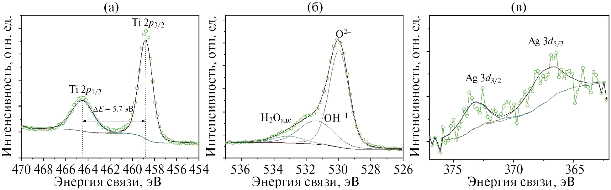 Рис. 5. РФЭС спектры: (а) — Ti2p, (б) — O1s, (в) — Ag3d, полученного in situ катализатора Ag/TiO2/F в реакции фотокаталитического окисления ацетона.