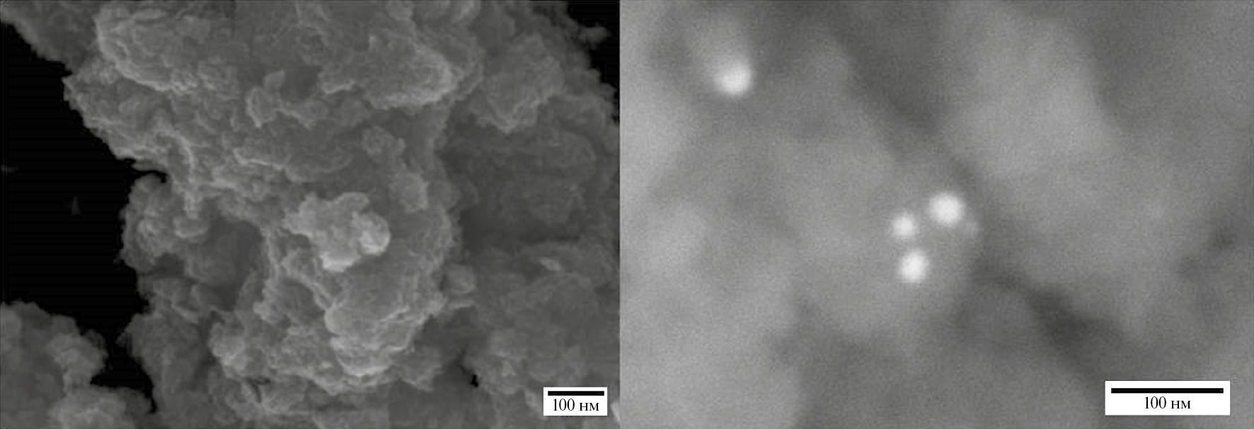 На микрофотографиях (рис. 6) полученного Ag/TiO2/F-катализатора методом РЭМ, видны агрегаты из наночастиц диоксида титана размером от 2 до 10 мкм, сформированные из наночастиц размером ~8 нм. На микрофотографии справа в режиме фазового контраста отлично видны наночастицы серебра, которые не были обнаружены с помощью рентгенофазового анализа. Данные катализатора элементного анализа подтверждают наличие серебра в количестве ~0.1 ат.%, в то время как атомы галогенов обнаружены не были.