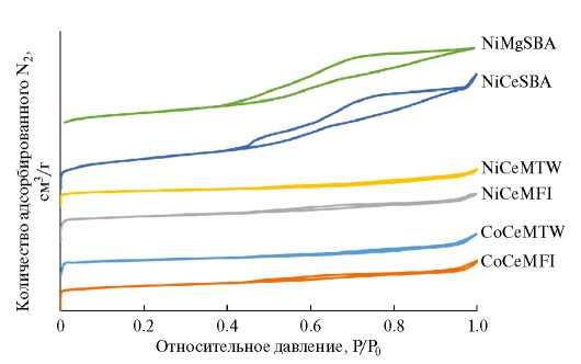 Синтезированные катализаторы были охарактеризованы физико-химическими методами анализа. Из анализа характеристик поверхности (табл. 1) следует, что катализаторы обладали высокой удельной площадью поверхности и средним диаметром пор в диапазоне 5–9 нм. Образцы на основе материала SBA-15 характеризовались большей величиной объема пор вследствие наличия мезопор в структуре материала, что подтверждается изотермой адсорбции (рис. 2). Как видно на рисунке, изотермы адсорбции, полученные при анализе катализаторов на основе материала SBA-15, принадлежат к IV типу с характерной для мезопористых материалов петлей гистерезиса, что подтверждает сохранение мезопористой структуры при синтезе катализаторов на основе материала SBA-15. В то же время изотермы адсорбции, полученные при анализе катализаторов на основе цеолитов, преимущественно относятся к типу II, что характерно для микропористых материалов.