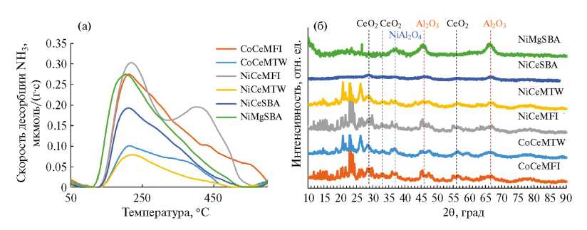 Кислотные свойства катализаторов были исследованы методом термопрограммируемой десорбции NH3. По результатам анализа (рис. 4а) выявлено, что наибольшее содержание кислотных центров характерно для образцов на основе цеолита MFI как цеолита с сильно выраженными кислотными свойствами. Наименьшей кислотностью характеризовались образцы на основе цеолита MTW. Следует отметить, что образцы на основе мезопористого материала SBA-15 характеризовались бóльшим содержанием кислотных центров, в отличие от цеолитсодержащих катализаторов CoCeMTW и NiCeMTW, что может быть связано с вкладом кислотных центров Al2O3, который входил в состав носителя в качестве связующего компонента. По данным рентгенофазового анализа (рис. 4б) установлено, что структура цеолитов не претерпевает изменений в процессе синтеза катализаторов (сигналы в области 2θ = 10°–27°). Полосы, характерные для фазы CeO2, значительно уширены, что не позволяет оценить размер кристаллитов и может свидетельствовать о равномерном распределении данной фазы на поверхности носителя.