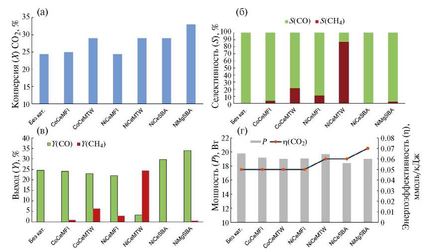 Рис. 5. Результаты плазменно-каталитического гидрирования CO2: а) конверсия реагентов; б) селективность по CO/CH4; в) выход CO/CH4; г) мощность и энергоэффективность.