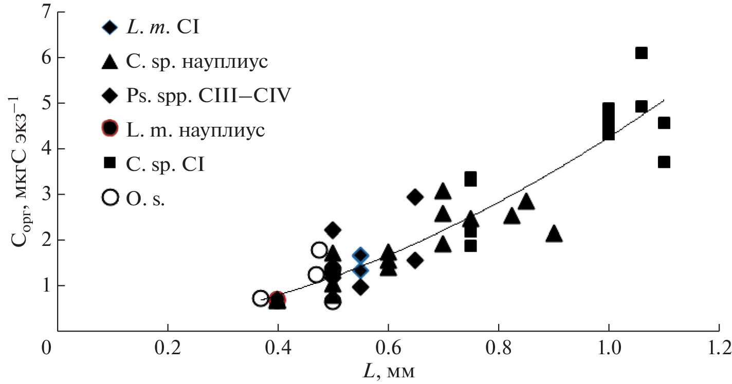 Organic carbon of fecal pellets and small-sized (≤ 1mm) zooplankton was measured using a high- temperature combustion method. The method was adapted for measurements with Shimadzu TOC-VCPH analyzer equipped with a manual injection module. The range of carbon content values was 30–10 000 ng ind–1. The samples for analysis were collected during the cruises of the R/V “Akademik Mstislav Keldysh”in the Kara Sea in 2019-2021. Relationship between body carbon (C, µg ind-1) and prosome length (L, mm) of zooplankton describes by the equation С = 4.24 L1.84, r2 = 0.85, n = 46. Carbon of field collected fecal pellet varied from 9.4 до 102.9 µg С mm–3. The carbon to chlorophyll a ratio of fecal pellets differed by more than two orders of magnitude. The highest values (542 and 736) were obtained in the bays of the Novaya Zemlya archipelago, the lowest (3–6) on the Kara sea shelf in June 2021 soon after ice melting. The perspectives of implication of high temperature combustion method for studies of zooplankton in situ feeding and to estimate the contribution made by pellets to POC vertical flux are discussed.