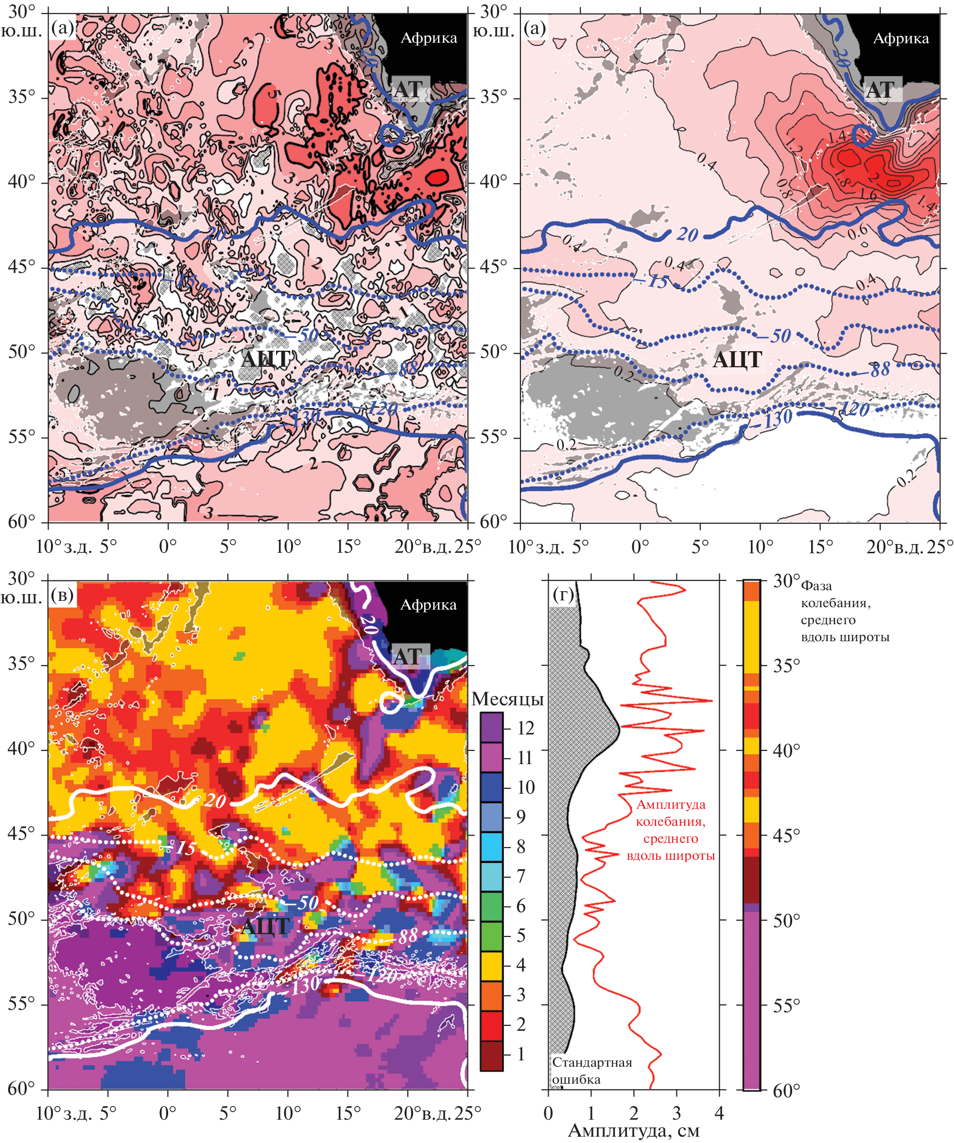 This paper describes a method for analyzing the seasonal variability of the structure of the gradient field of Absolute Dynamic Topography (ADT) based on the satellite altimetry data. This structure is understood as the alternation in the meridional direction of the zones of increased values of the absolute values of the ADT gradient and the zones of their lower values, i.e. jets and inter-jet gaps. The technique uses linear and harmonic regression analyzes and makes it possible to calculate the amplitudes and phases of stationary harmonic oscillations that approximate the seasonal variations in the meridional shift of the structure of the ADT gradient field and in the absolute values of the ADT gradient, as well as to estimate the calculation error. Based on this technique, corresponding calculations were made for the Antarctic Circumpolar Current (ACC) band south of Africa (from 10 ° W to 25 ° E). In particular, the amplitude of the seasonal variation of the meridional shift of the ADT gradient field for the ACC as a whole was 0.009 ± 0.013° latitude with a maximum northward shift in December. At the same time, there are zones within the ACC band where this amplitude reaches 0.12°, 0.16° and 0.28° latitude. The amplitude of the shift of the indicated field relative to the scale of the ADT itself within the ACC band at different scales is 0.6–2.5 cm. It is shown that this shift is mainly due to the seasonal variation of the ADT at geographic points. The amplitude of the seasonal variation of the ADT gradient modulus relative to both latitude and the ADT scales increases from 1 × 10–3 cm/km in the central part of the ACC to 6–7 × 10–3 cm/km at the southern and northern peripheries.