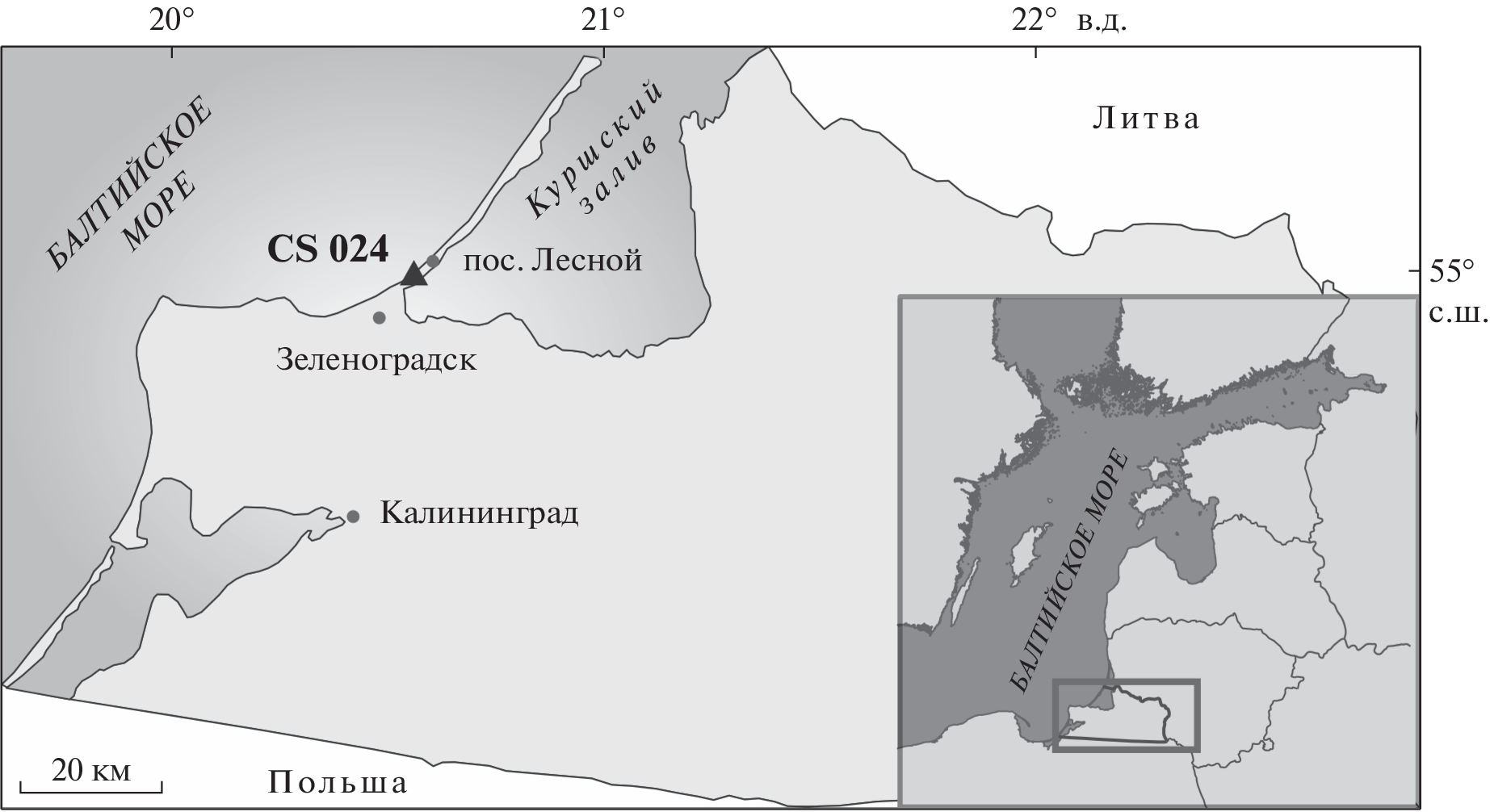 As part of paleogeographic studies on the Curonian Spit (geological section GS 024), a coastal section was studied from the sea in the area of the village Lesnoy in the place where relic lagoon oozes come out. The granulometric, chemical and mineral compositions of slope sands were studied for the first time. The heterogeneity of the conditions for the formation of sand strata was confirmed. A high probability of a secondary change in the composition of sediments as a result of weathering processes was revealed. The results of the study indicate a gradual advance of sand deposits on the coastal part of the lagoon, which began about 10 thousand years ago. Differentiation of the sand stratum into the lower and upper parts relative to the interlayer-marker of coarse-grained sand identified in the section may reflect different stages of generation of the sand stratum: from the supposed shallow swell formed during sea level rise to beach and eolian sands.
