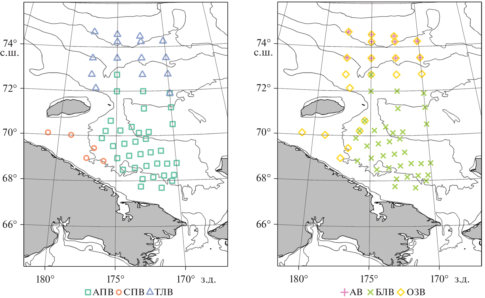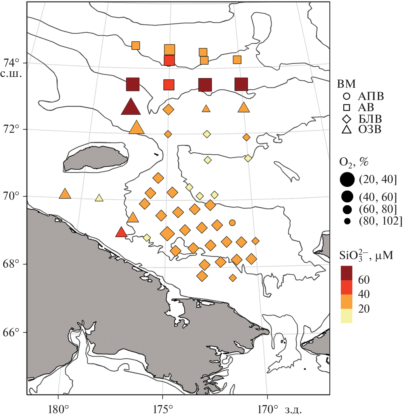 The distribution of water masses in August 2019 in the Chukchi Sea, and their hydrochemical features are i-nvestigated using shipboard data from the transarctic expedition onboard the R/V Professor Levanidov. The work was carried out in the southern shallow part of the sea and in the northern part of the sea outside the 70-meter isobath. Six main water masses were identified: Alaskan and Anadyr Coastal Water (ACW), Siberian Coastal Water (SCW), Melt Water (MW), Summer Bering Sea Water (BSW), Remnant Pacific Winter Water (RWW) and Atlantic Water (AW). Their features are described and analyzed. It was revealed that the water masses of the Chukchi Sea are characterized by a high spatial variability of hydrochemical parameters, especially the BSW, RWW and AW. In the southern part of the Chukchi Sea the presence of very high values of ammonium nitrogen in the bottom layer was noted (up to 12.6 µM). In august 2019, transformed AW, typically residing below 150 m, were observed at a depth of 117–137 meters, characterized by salinity values from 34.2 to 35.7, high content of mineral silicon (93–97 µM), low elevated values of apparent oxygen utilization (240–270 µM), and unusually low N* (a measure of the fixed nitrogen excess relative to phosphorus) values (down to −24.0 µM). At the same time, the AW observed at depths below 140 m did not have such hydrochemical features.