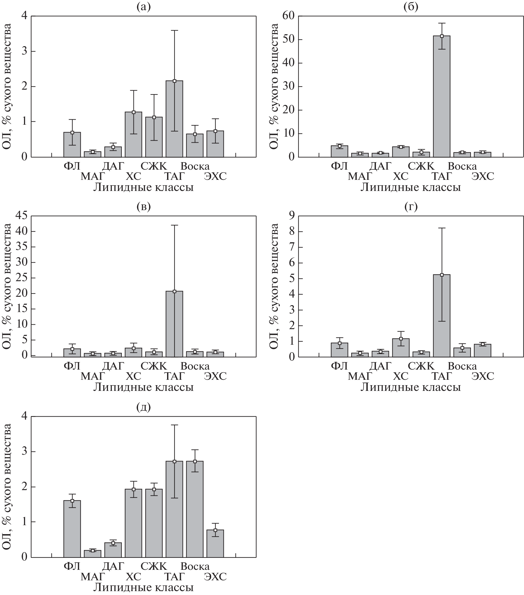 - Olsen R.E., Henderson R.J. The rapid analysis of neutral and polar marine lipids using double-development HPTLC and scanning densitometry // J. Exp. Mar. Biol. Ecol. 1989. V. 129. P. 189–197.