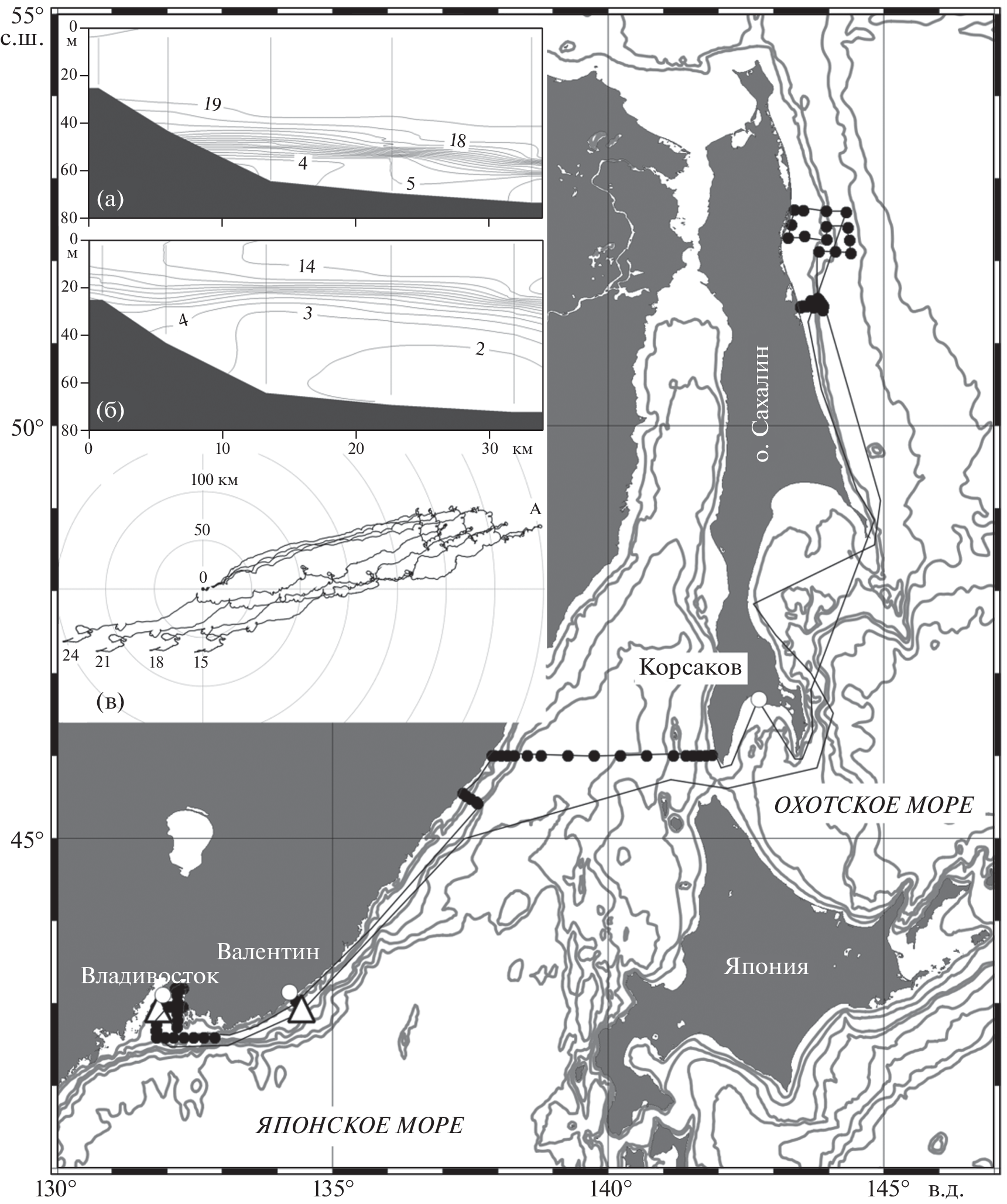 Investigation of interannual and short-term variability of the water parameters in the Japan and Okhotsk seas and their ecological state were continued in the cruises No. 77 of the R/V Professor Gagarinskiy and No. 97 of the R/V Akademik M.A. Lavrentyev in fall-winter season of 2021. CTD profiling and water sampling for chemical analyses including methane and radioisotopes were implemented. A mooring of bottom autonomous station was deployed for 2.5 month. The long-term trend of the bottom water warming, eutrophication and acidification of the Japan Sea have been confirmed. The features of the fall-winter restructuring of the field of currents of the northern part of the Sea of Japan, the multifrontality of the Sakhalin upwelling structure, and the bimodality of the Primorye Current are shown.