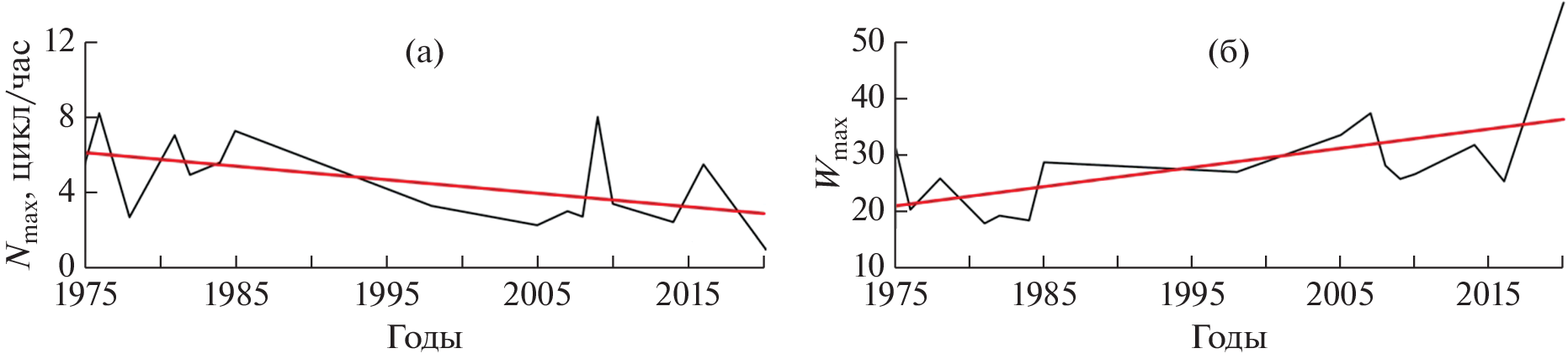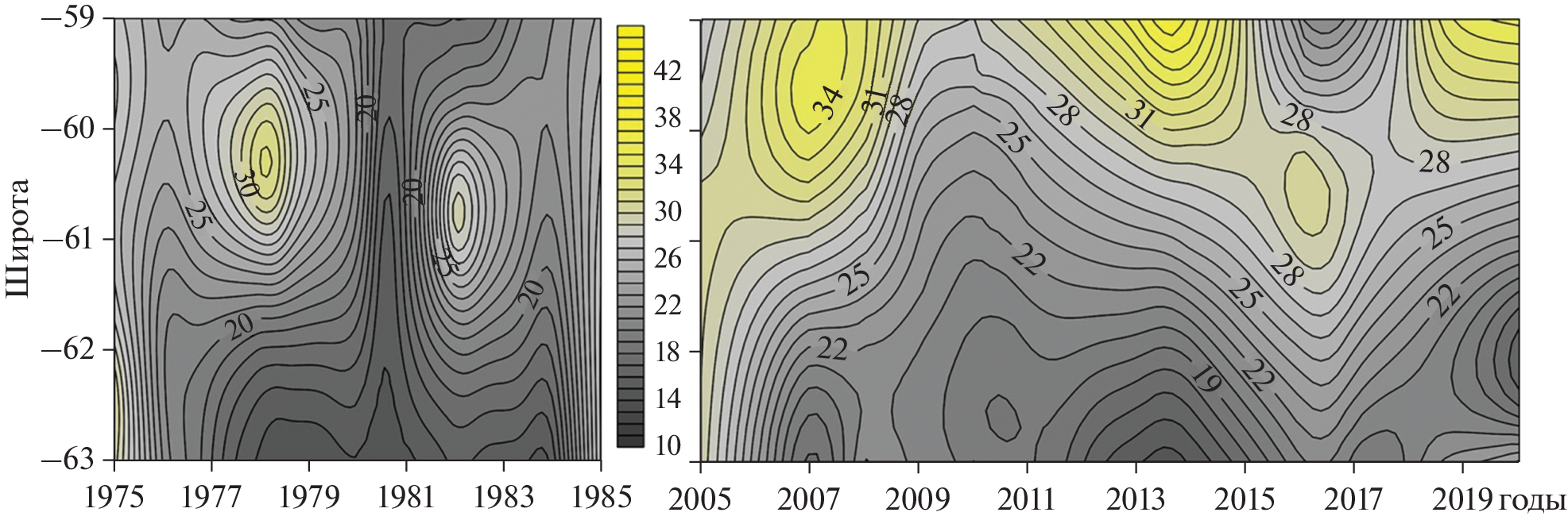 The trend assessment of the dynamic state of the Powell Basin waters in the Weddell Sea was made on the basis of the hydrological data of the 79th cruise of the R/V AkademikMstislavKeldysh (January 16–February 6, 2020) and the World Ocean Database-2018 data for January-February from 1975 to 2020. At each node of the quarter-degree grid, a linear trend was constructed for the calculated values of the maximum buoyancy frequency and the maximum amplitude of the vertical component of the internal wave velocity. It is shown that the southwestern and northwestern parts of the Powell Basin differ significantly in their hydrophysical characteristics. In the northwest of the basin, the linear trend of the maximum buoyancy frequency is negative, the trends of the depths of the maximum values of the Väisälä-Brent frequency and the amplitude of the vertical velocity component are positive. In the southwestern part of the basin, the opposite is true: the trend of the maximum buoyancy frequency is positive, the trends in the depths of the maximum values of the Väisälä-Brunt frequency and the amplitude of the vertical velocity component are negative.