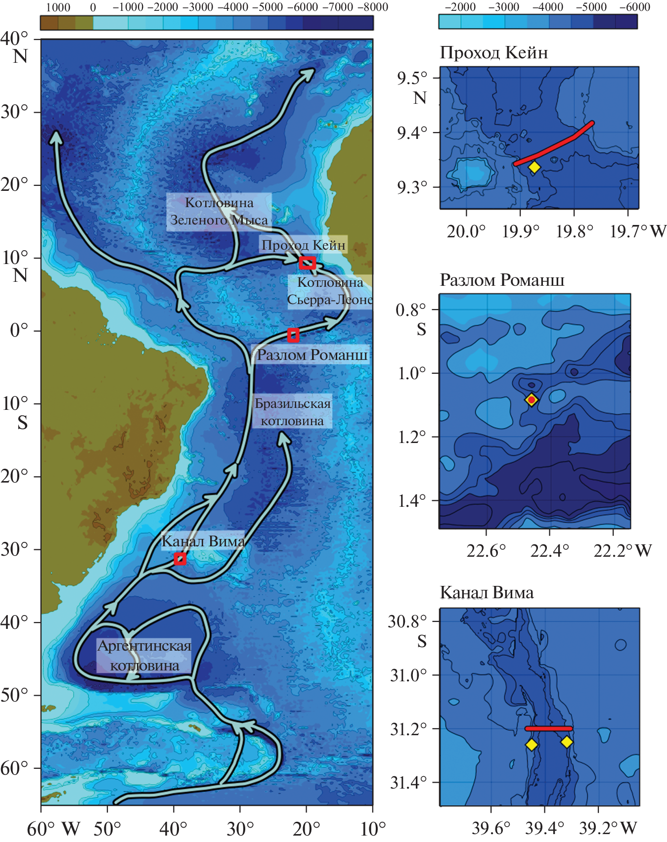 - Tarakanov R.Y., Morozov E.G, van Haren H. et al. Structure of the deep spillway in the western part of the Romanche Fracture Zone // Journal of Geophysical Research: Oceans. 2018. V. 123. № 11. P. 8508–8531. https://doi.org/10.1029/2018JC013961