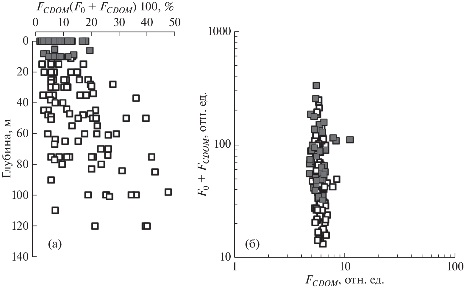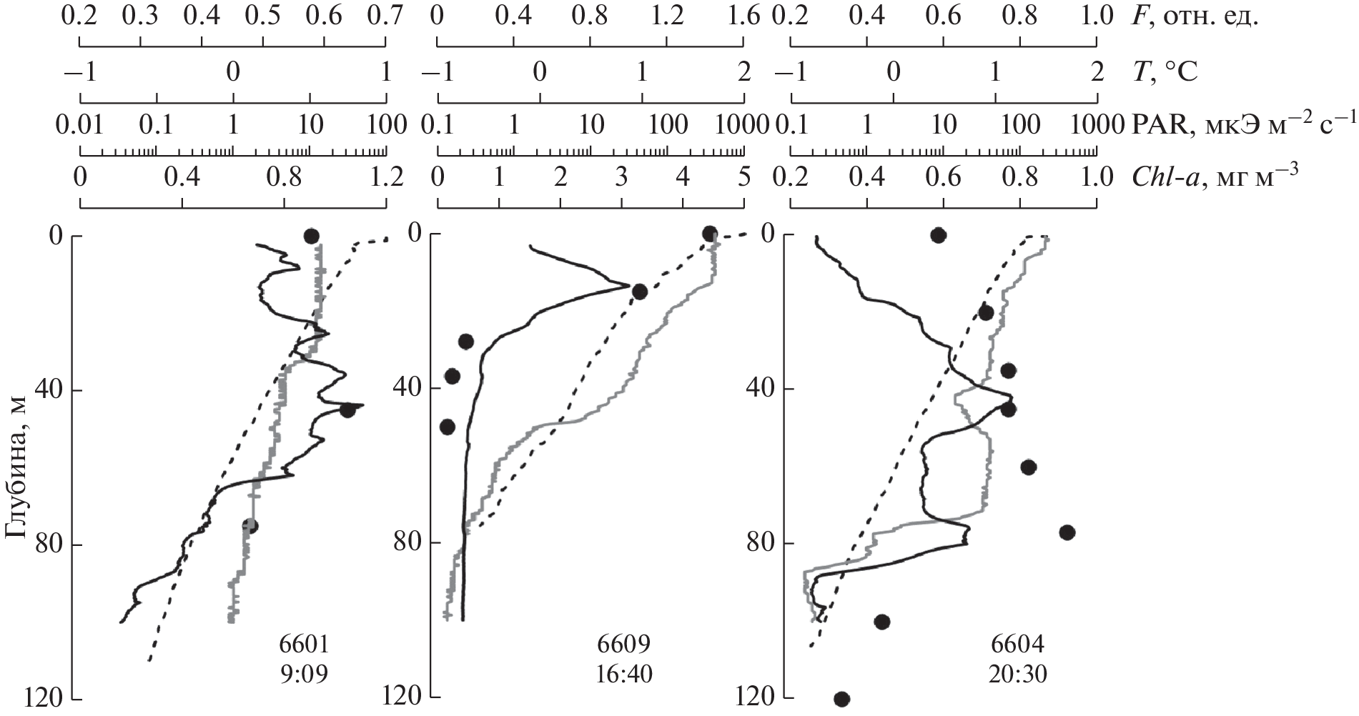 The studies were carried out in cruise 79 of the R/V Akademik Mstislav Keldysh. The variability of the chlorophyll a specific light absorption coefficient of phytoplankton and the coefficient of correlation between the fluorescence intensity and chlorophyll a concentration at various optical depths under basic lighting conditions and after dark adaptation was studied. It is shown that in the absence of water stratification, there is no vertical variability in the chlorophyll a specific light absorption coefficient of phytoplankton. It was found that when measuring the intensity of chlorophyll a fluorescence with a submersible sensor, without preliminary dark adaptation, a decrease in the fluorescence intensity signal in the upper layer of water is observed, which is associated with the effect of illumination on the fluorescence quantum yield.