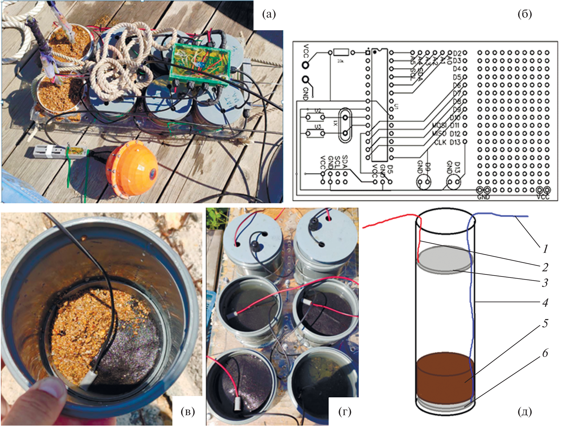 The bioelectrogenic activity of sediments of natural microbial association of the Peter’s Bay of Japanese sea research was performed in a year-round experiment with parallel temperature, illumination and water electrical conductivity monitoring by means of benthic microbial fuel cell (MFC) and automatic online-monitoring. Several variants of underwater devices, including benthic microbial fuel cells, monitoring water environment sensor,information collection and transmission systems, have been developed. This device make electrical voltage up to 216 mV, specific power up to 239 mW/m2. Electrogenic activity of natural microflora depends on water temperature and reach maximum on summer with temperature about 20–25°C. The introduction of toxicants in form as hydrocarbons and cadmium into the sluge led to the suppression of microbial electrogenesis. However the introduction of inductor substances of microbial sulfidogenesis led to the stimulation of microbial electrogenesis. The possibility of functioning of the benthic MFC in the field of the Peter’s Great Bay in various climatic periods is shown. It is shown that such experimental devices serve as a basis for autonomous stations monitoring the state of the aquatic environment for a long time and in a wide range of conditions change. Thus, automatic registration of temperature, illumination and salinity of water with a frequency of 48 times a day was carried out for 13 months (11/28/2019–12/31/2020). The electrogenic activity of this microbiota upon MFC scaling can potentially become a new renewable energy source for low-power marine electronics, including those used in mariculture.