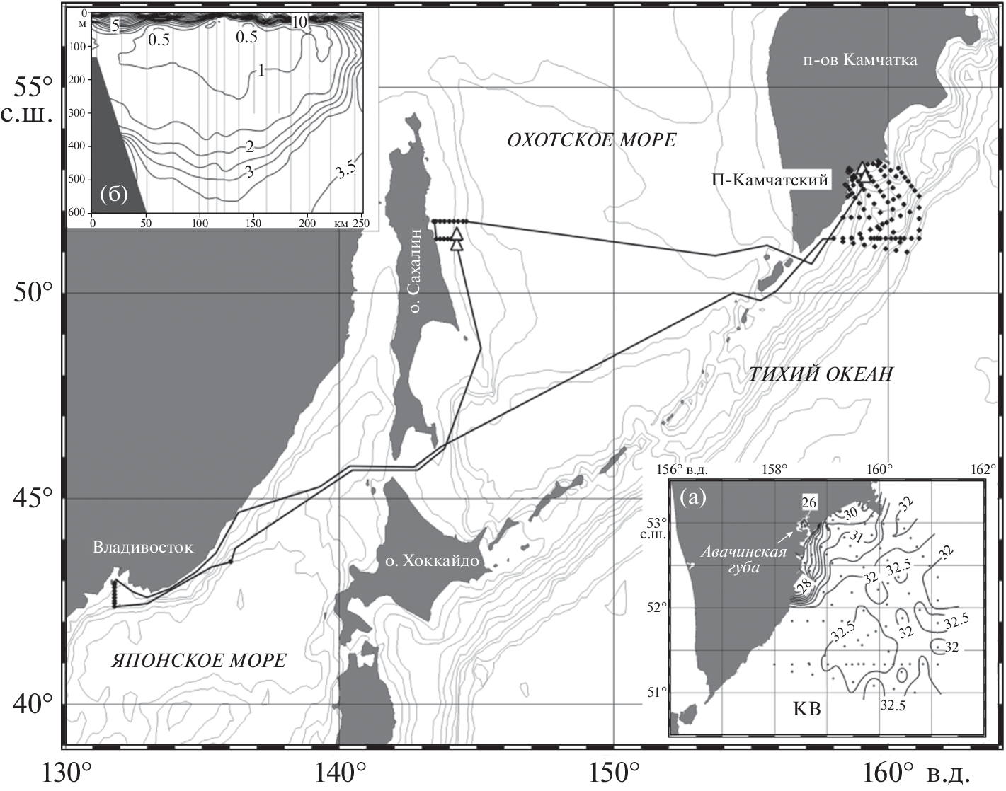 In the cruise No. 80 of the R/V Professor Gagarinskiy, from June 15 to July 18, 2022, complex hydrographic and hydrochemical studies were carried out in the Avachinskiy Bay of Kamchatka Peninsula, on the northeastern shelf of Sakhalin Island and in Peter the Great Bay to assess current environmental risks in the coastal zone of key areas of the Far Eastern seas of Russia and, in particular, to study possible abiotic factors that caused the mass mortality of marine organisms in Kamchatka in the fall of 2020. Comprehensive observations including CTD, hydrochemical water sampling, moorings deployment as well as sampling of plankton and bottom sediments were performed. An increased content of nutrients was found, both in subsurface and intermediate Pacific waters, in comparison with the data of the 1990–2000s. Intensive snowmelt on the adjacent mountain slopes during the survey period showed a significant effect of continental runoff on the hydrochemical characteristics of Avachinskiy Bay waters, causing a decrease in salinity and a significant increase in the concentration of nutrients and chlorophyll-a in the coastal zone. The dynamics of mesoscale eddies ensures the transport of coastal waters to the ocean over a distance of more than 100 miles. The obtained results suggest that the catastrophic phenomenon off Kamchatka, associated with anomalous harmful algae bloom, is due to the conjugation of biogeochemical and hydrographic factors – river runoff and the intrusion of deep waters on the shelf caused by coastal wind and dynamic upwelling during the period of maximum warming and eutrophication of the waters of the subarctic Pacific, as well as orographic and topographic features of Avachinskiy Bay.