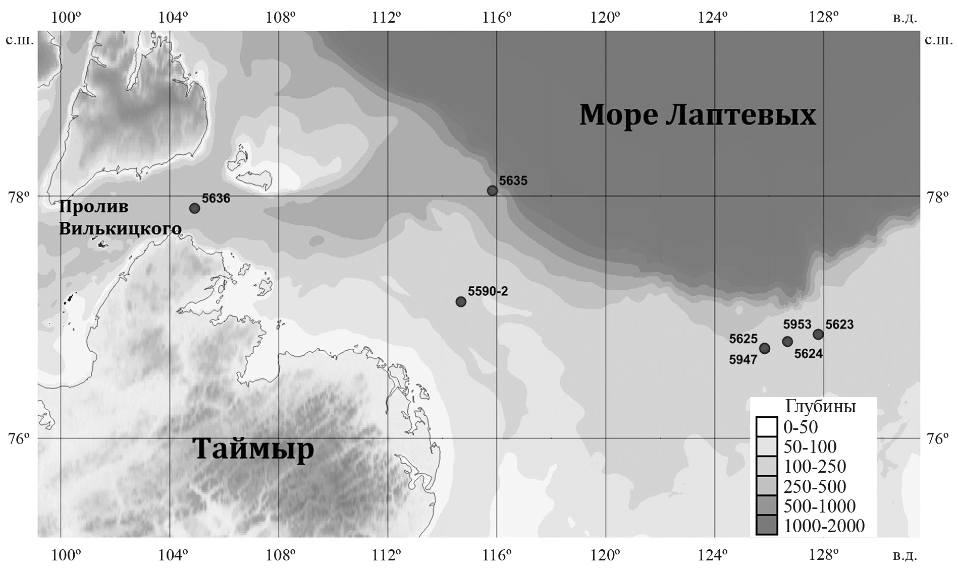 В море Лаптевых донная фауна была собрана на шести станциях, расположенных вдоль Хатангского разреза на внешней кромке шельфа (ст. 5590-2), континентальном склоне (ст. 5635), в проливе Вилькицкого (ст. 5636), а также на двух полях метановых высачиваний (ст. 5623, поле Оден, ст. 5625, поле С-15) и фоновом районе (ст. 5624) (см. табл. 2).