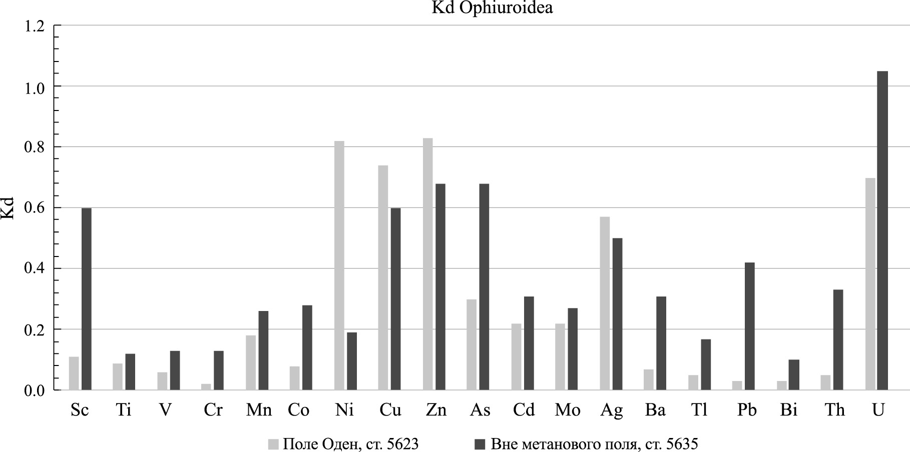 Ткани без содержимого кишечника детритофага офиуры Ophiocten sericeum на поле метановых выходов Оден (ст. 5623) и на континентальном склоне (ст. 5635) существенно обеднены всеми микроэлементами относительно содержимого кишечника (Kd <1). Однако, как и в случае с двустворками, Kd тяжелых металлов Ni, Cu, Zn и Ag в офиурах поля Оден заметно выше, чем в фоновом районе континентального склона (см. рис. 3). В проливе Вилькицкого в тотальных пробах офиур повышены содержания Zn, As, Cd, Ag и U (см. табл. 5). Это может быть обусловлено влиянием антропогенного фактора, который отражается в высоких концентрациях и индексах загрязнения As, Zn, Cd и U в поверхностных донных осадках пролива Вилькицкого [25].