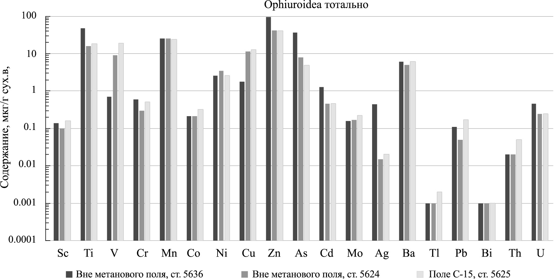 Данные по биомассе этих животных, поднятых со дна дночерпателем Ван-Вина, взяты из работы [49]. Согласно этим данным, на поле С-15 биомасса Portlandia arctica составляет 0.7 г/м2, Ophiocten sericeum — 7.2 г/м2, а на фоновой станции 5624 биомасса O. sericeum в десять раз меньше (0.6 г/м2). На метановом поле С-15 O. sericeum обладает значительно большим БП по сравнению с P. arctica для всех элементов (см. табл. 11). При этом офиуры аккумулируют каждый из микроэлементов на поле С-15 значительно больше (до 40 раз), чем на фоновой станции. Среди элементов значения БП варьируют в широких пределах: 5–288 мкг/м2 для Ni, As, Ba, Cu, Ti, V, Mn и Zn. Максимальный БП определен для цинка (до 300 мкг/м2). Для остальных элементов, в том числе токсичных Ag, Cd, Pb, Bi, Th и U, БП значительно более низкий — от <0.01 до 2 мкг/м2.