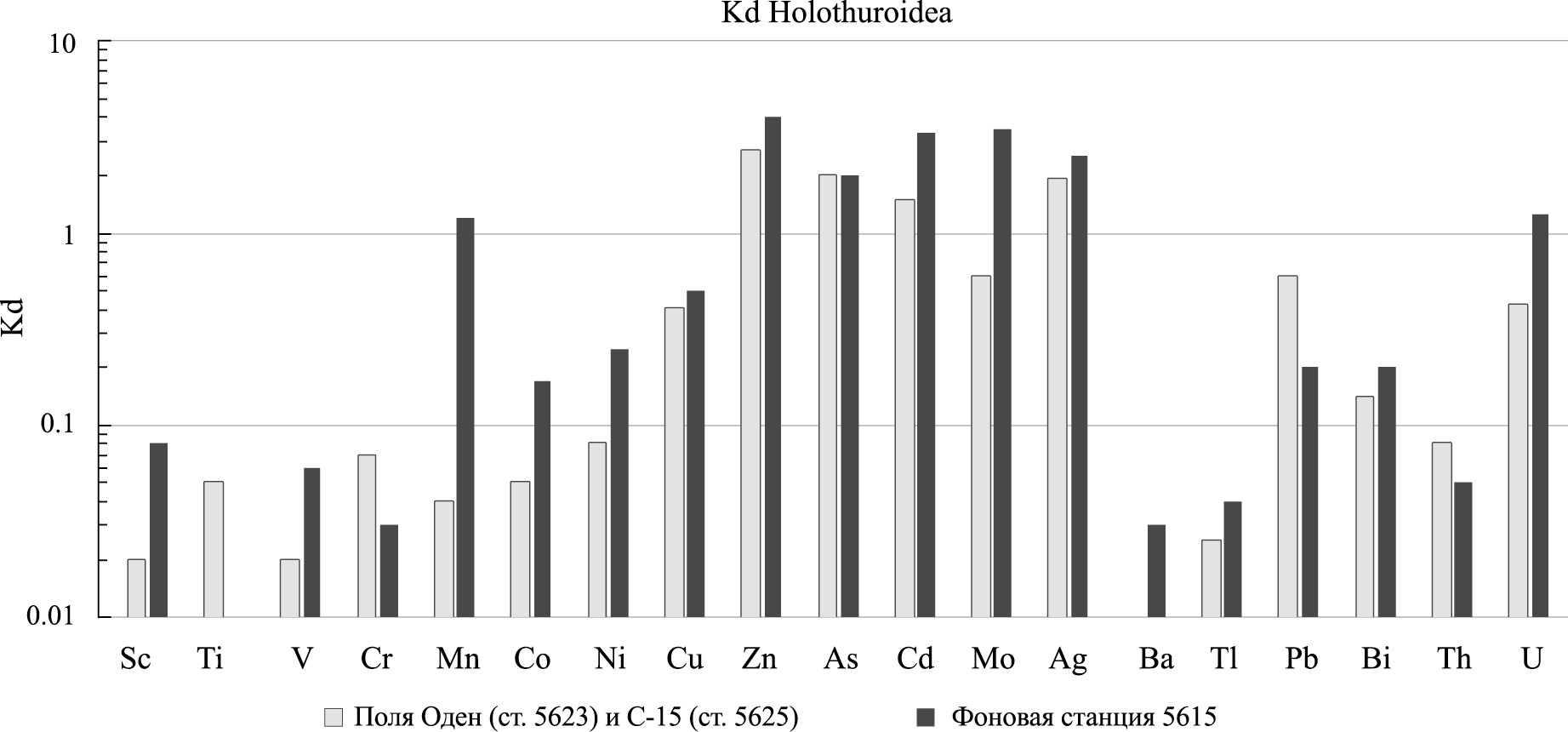 Как и в случае других исследованных грунтоедов, в содержимом кишечника голотурий Myriotrochus rincki, концентрации большинства элементов намного выше, чем в их мягком теле (см. табл. 7 и рис. 6). Исключение составляют Zn, As, Cd и Ag, показывающие заметное обогащение мягких тканей (Kd = 2–3) как на полях Оден и С-15, так и на фоновой станции Восточно-Сибирского моря.