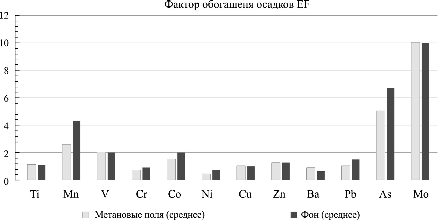 Для количественной оценки обогащения осадков химическими элементами относительно верхней части континентальной коры (UCC) обычно используется фактор обогащения EFx [43]. Он рассчитывается по формуле EFx= (Cx/CAl)осадок/(Cx/CAl)UCC, где Сx и CAl — содержание элемента x и Al в изучаемых пробах и в верхней части континентальной коры соответственно [41] (см. табл. 10). Величина EFx <1 означает отсутствие обогащения (или обеднение), EFx 1–3 показывает заметное и EFx >3 – значимое обогащение исследуемых осадков [19]. Можно видеть, что на метановых полях и на фоновых станциях значения EFx для Ti, Cr, Ni, Cu и Ba не превышают 1, для Zn и Pb чуть больше 1 (1.25 и 1.5 соответственно) (рис. 7).