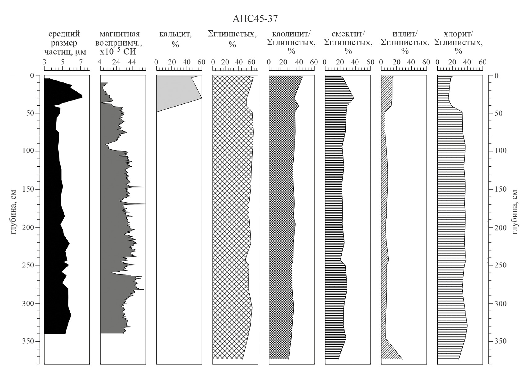 Литологическая характеристика. В колонке АНС45-37 выделены три интервала. Верхний слой (0–36 см) представлен окисленным желтовато-коричневым слабоизвестковистым глинисто-тонкосилтовым умеренно биотурбированным илом. Ниже по разрезу (36–45 см) выделяется переходный слой, сложенный темно-желтовато-коричневым плотным глинисто-тонкосилтовым илом с железисто-марганцовистыми корками и прослоями. В интервале 45–379 см колонка вскрыла восстановленный оливково-серый глинисто-тонкосилтовый ил с многочисленными примазками (реже пятнами) гидротроилита. Вниз по разрезу содержание терригенных зерен незначительно увеличивается (слюда, кварц), а содержание остатков кремневых и карбонатных организмов остается примерно на постоянном уровне.
