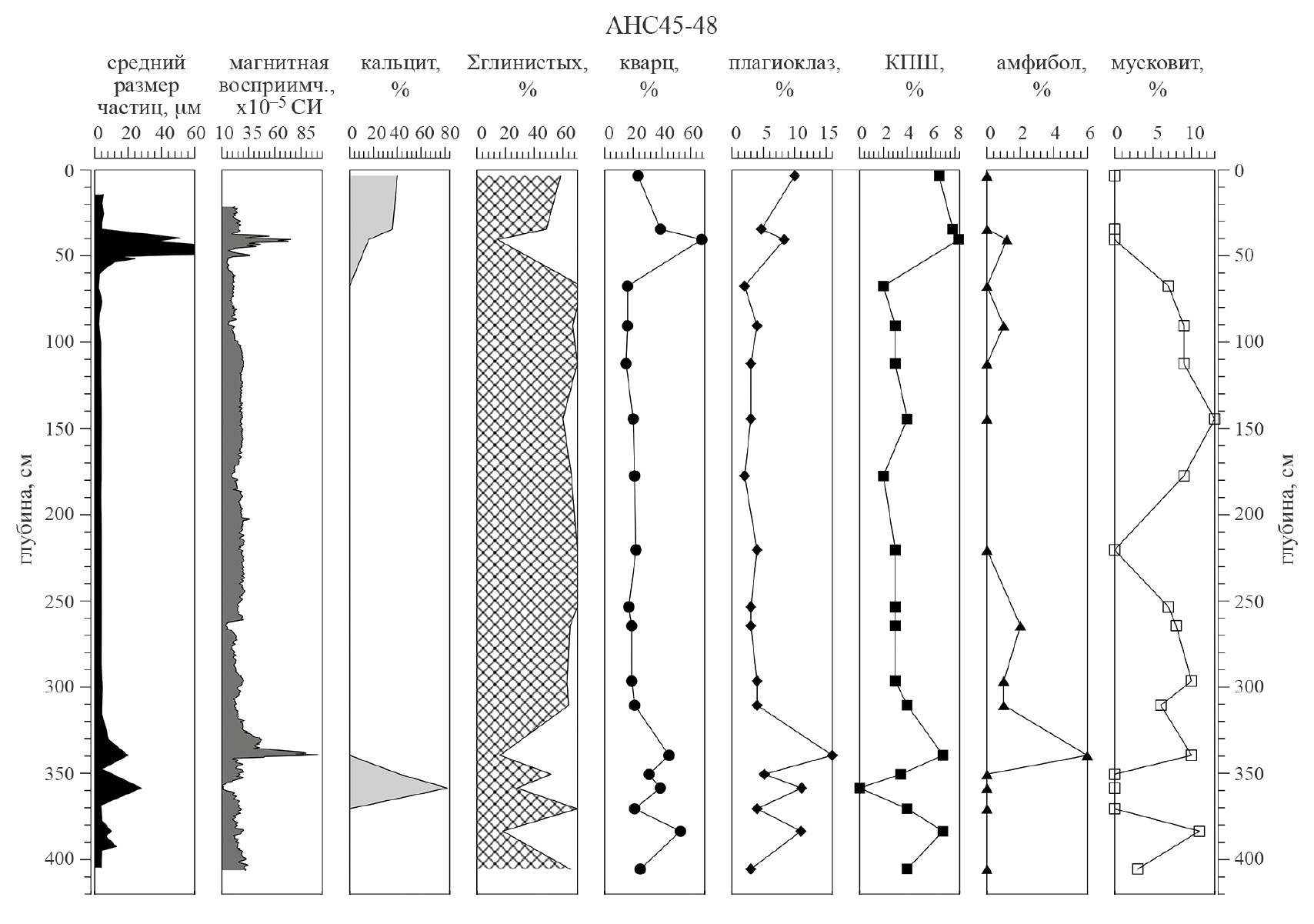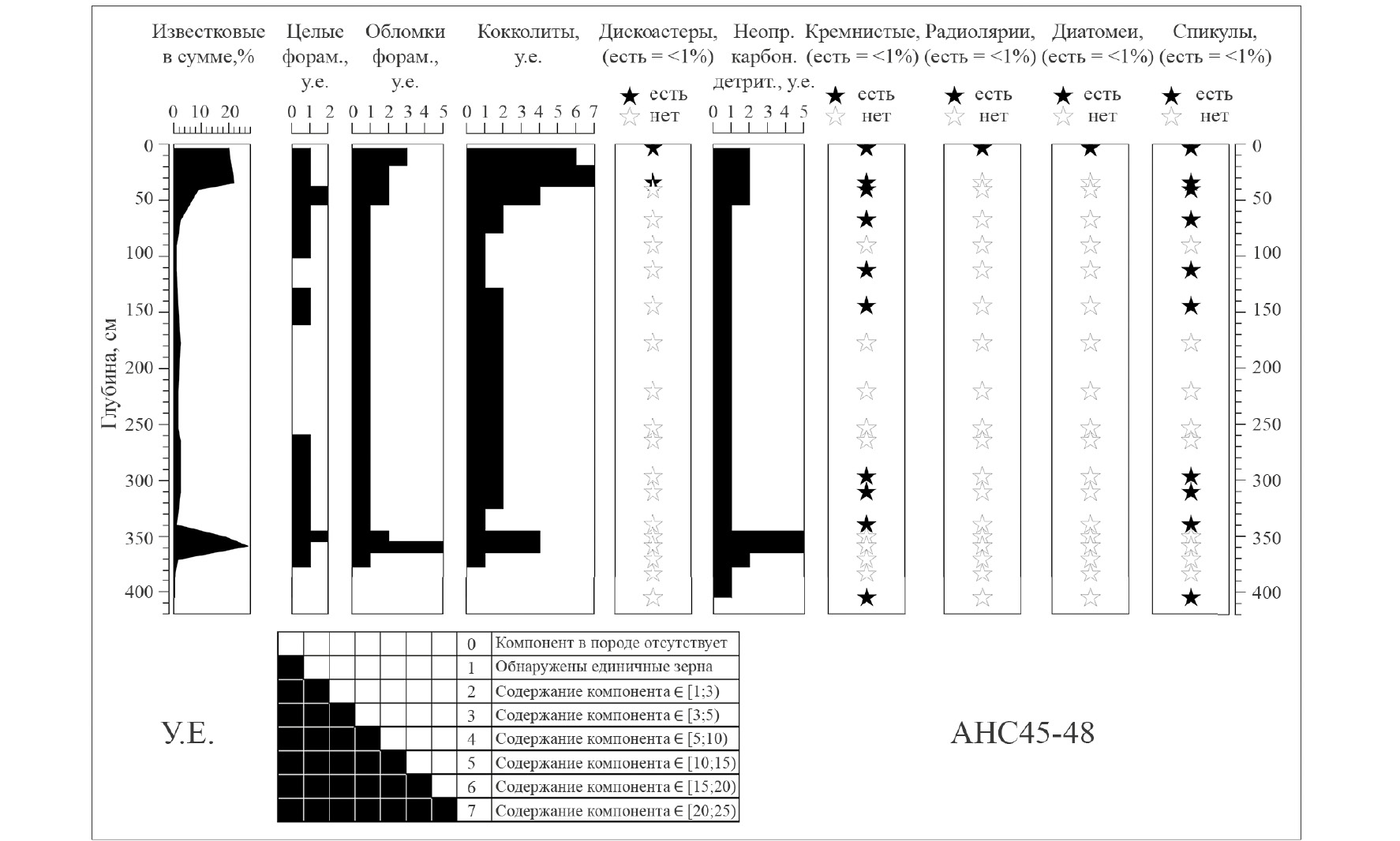 Колонка АНС45-48 представлена в верхней части известковистыми (до известковых) илами и фораминиферовым песком. Три интервала обогащены терригенными зернами песка и силта: 36–48 см, 72–81 см, 338–341 см. Окислительно-восстановительная граница на 94 см очень резкая. Ниже этой границы в восстановленных осадках встречается большое количество наземной органики и выделений гидротроилита. В интервалах 341–354 и 354–361 см выявлено значительное обогащение биогенным карбонатным материалом: в первом интервале — птероподовый ил, во втором — полосчатый фораминиферовый ил (полосы с более крупными и более мелкими раковинами).