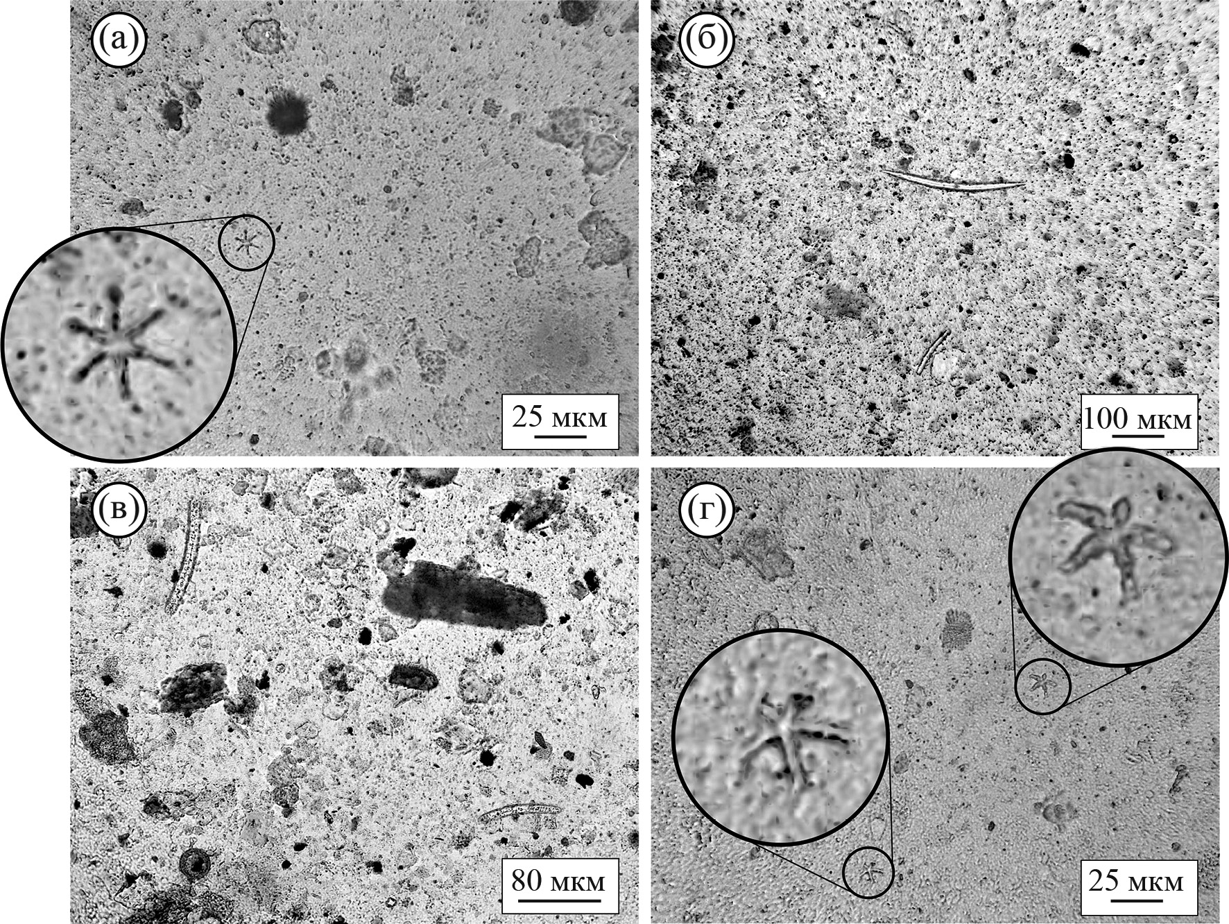 Рис. 9. Микрофотографии смер-слайдов с изображением разных биоморфных объектов, состоящих из кальцита (а, г) и опала А (б, в). a — Discoaster broweri, АНС45-37, 20 см; б — спикула, АИ-4126, забой; в — спикула, АНС45-48, 40 см; г — Discoaster pentaradiatus, АНС45-37, 10 см