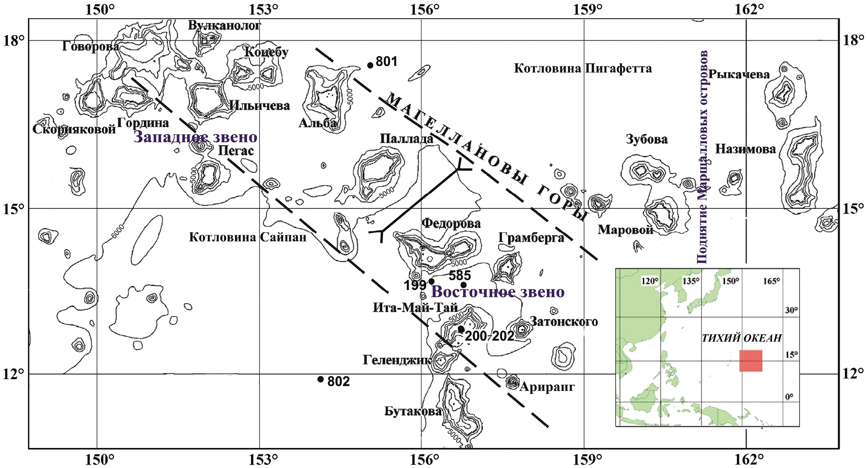 Магеллановы горы — дугообразная цепь подводных вулканических гор длиной более чем 1300 км делит Восточно-Марианскую котловину на впадины Пигафетта и Сайпан. На юго-востоке они граничат с поднятиями Маршалловых и Больших Каролинских островов, а на западе — с Марианской системой желобов. Обычно в гряде Магеллановых гор выделяют Западное и Восточное звено (рис. 1). Ряд исследователей считает, что первоначально Магеллановы горы сформировались на 20–30° ю.ш. на подводном плато Онтонг-Ява в горячей точке SOPITA (South Pacific Isotopic and Thermal Anomaly) и затем были перемещены тихоокеанской плитой в место их современного расположения [9, 27]. Другие полагают, что они образовались на месте пересечения глубинных разломов в результате сдвиговых деформаций [20, 21] или иных тектонических растяжений земной коры при движении плиты [17, 18, 34, 35]. Время образования Магеллановых гор датируют широким возрастным интервалом от поздней юры до раннего мела включительно [5, 8, 27]. Все эти гипотезы объединяет то, что они базируются преимущественно на геофизических данных и сведениях о рельефе дна и мало аргументированы прямыми геологическими данными по самим гайотам.