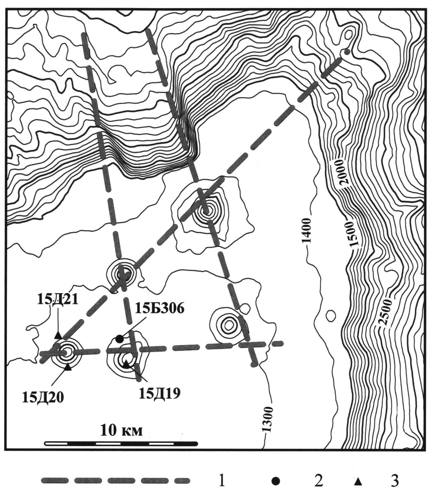 Купола и конусы могут преобладать на склонах или отрогах, но чаще они покрывают вершинные плато. Группа из пяти конусов локализована на плато гайота Альба [12]. Крупнейший из них расположен ближе к северо-восточному отрогу, имеет диаметр основания 5.1 км, а высоту около 750 м (рис. 2). Над ним зафиксирована и минимальная отметка над гайотом — 551 м. Геологическое опробование поверхностей конусов не оставляет сомнения в их вулканическом происхождении, поскольку они сложены щелочными базальтоидами, их туфами и туффитами. Геологический возраст структур был определен как среднемиоценовый на основе К-Ar и биостратиграфического метода [12]. Следует добавить, что конуса попарно расположены на продолжении сбросов — уступов, ограничивающих локализованный на северном склоне гайота радиальный грабен (см. рис. 2). Это, с одной стороны, позволяет предположить, что они образуют единую систему, а с другой — вероятно, и образование грабена можно датировать средним миоценом. На гайоте Говорова выделен протяженный линеамент, представляющий собой цепочку, более 30 км, вулканических конусов и куполов, вытянутую вдоль северо-восточной бровки вершинного плато [12].