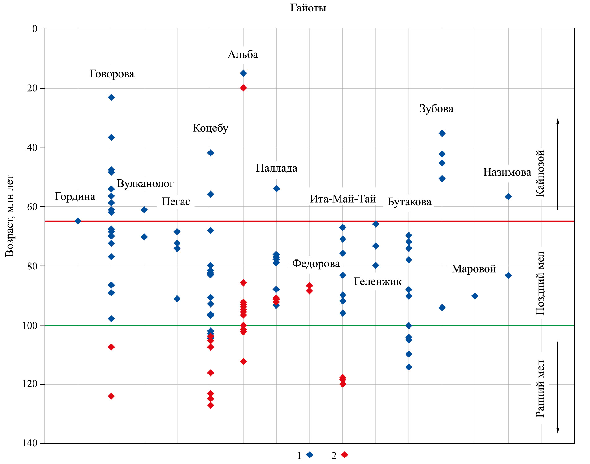 Временной этап становления структур Магеллановых гор определяется по-разному. Ряд исследователей считает, что он пришелся на границу юры и мела [5]. По другим источникам это происходило на рубеже готерива–баррема [3] или в апт–альбское время [27]. Их возраст по палеомагнитным данным оценивается интервалом 129–72 млн лет [29, 34]. Новые изотопные датировки магматических пород показали, что гайоты Альба, Говорова и Коцебу могли начать свой рост со среднего мела (поздний баррем) [31]. Это хорошо согласуется с вышеуказанными палеомагнитными данными и указывает, что вулканический пьедестал и цоколь сформировались за достаточно короткое время.