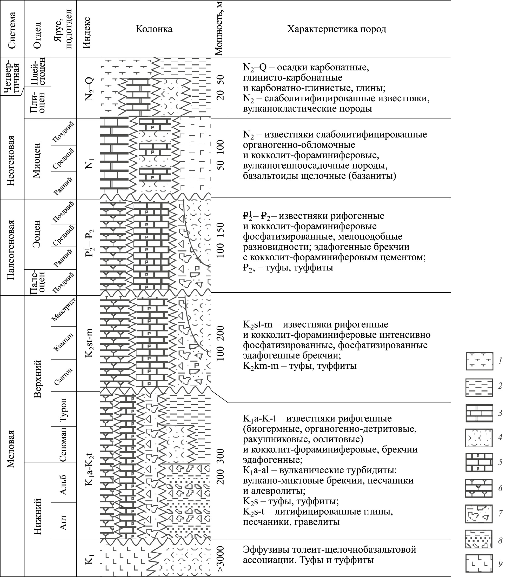 Осадочные породы. Осадочный чехол наиболее изучен на гайотах Федорова, Ита-Май-Тай, Геленджик, Бутакова, Говорова и Альба. Строение осадочных разрезов Западного и Восточного звена имеет сходные возрастные комплексы и близкий набор литологических пород в них. На основе биостратиграфического анализа выделены следующие возрастные комплексы: апт — сеноман, сантон — маастрихт и поздний палеоцен — эоцен [6, 15]. Венчают геологический разрез нелитифицированные осадки неоген–четвертичного возраста. В олигоцене — раннем миоцене (?) отмечен региональный стратиграфический перерыв осадконакопления (рис. 4).
