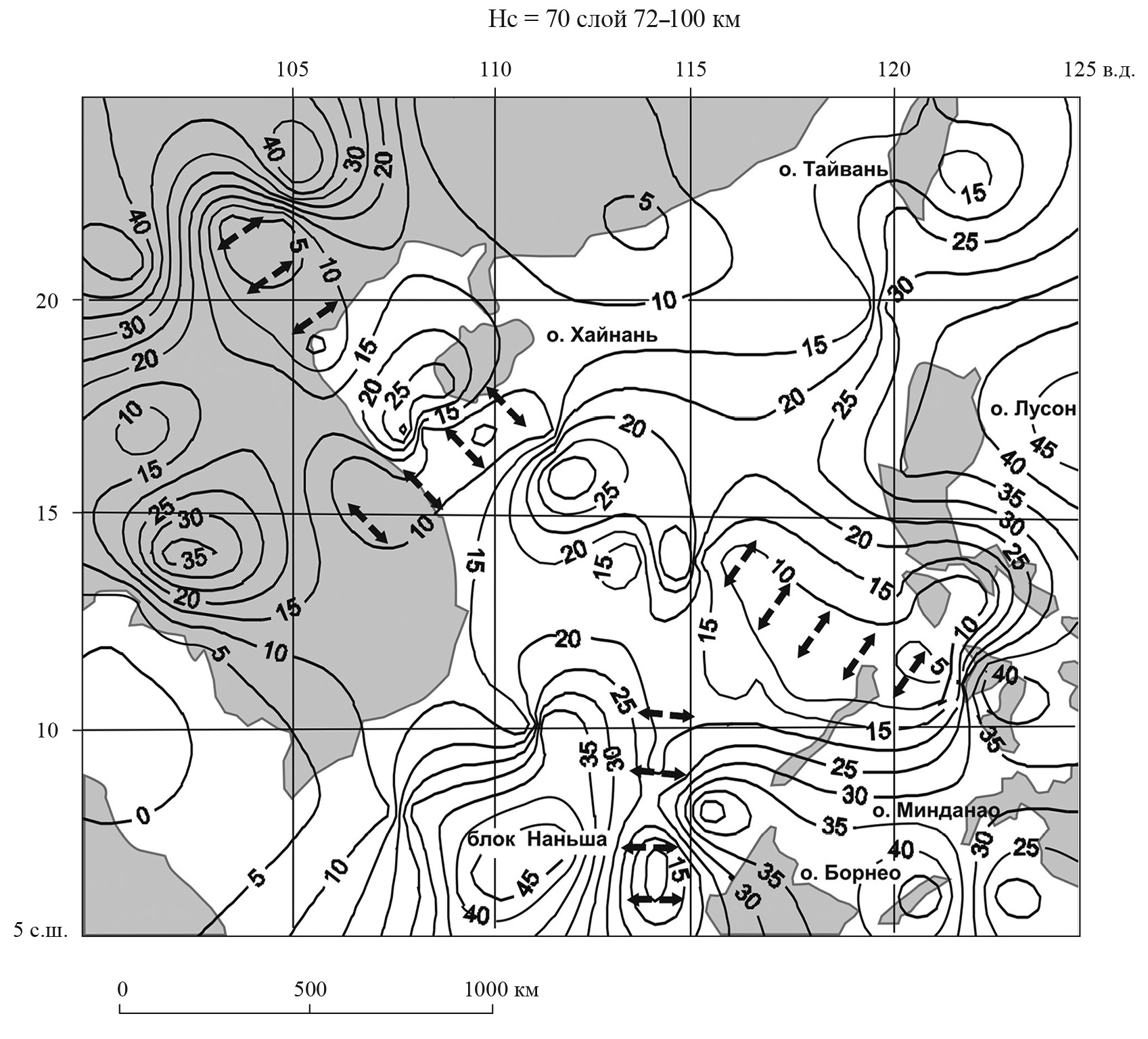 Территория Южно-Китайского моря детально исследована сейсмическими зондированиями, в результате которых на многочисленных профилях откартирован рельеф подошвы осадочных отложений и подошвы земной коры [35, 49, 61]. Мощность земной коры в Южно-Китайском море варьирует от 30 км в прибрежно-материковых районах до 6–8 км в центре моря. В результате сейсмотомографических исследований, использующих волны землетрясений, составлены модели распределений скорости сейсмических волн до глубины 700 км [23, 42] и схемы мощности литосферы [23, 49, 53]. В большинстве сейсмотомографических моделей мощность литосферы в центральных районах моря составляет 60–70 км, хотя по некоторым оценкам [53] она может быть сокращена до 50 км.