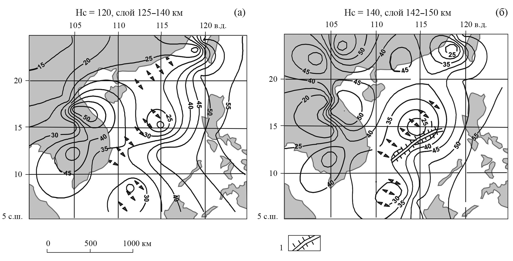 В подастеносферных срезах верхней мантии (рис. 6) зоны растяжения–сдвига СВ простирания преобладают. В срезе на глубине 120 км ясно проявлен сдвиг, а на глубине 140 км — зона растяжения. Мантийная зона растяжения смещена относительно оси спрединга (см. рис. 6б), из чего можно заключить, что процессы растяжения в Южно-Китайском море, если они были унаследованы от спрединга, мигрировали в СЗ направлении. В противном случае они могли происходить позже, независимо от более раннего спрединга, и быть связанными с цикличной (колебательной) субдукцией, в процессе которой возникали откаты, либо образовывались разрывы субдуцирующих слэбов (слэб-виндоуз-стуктуры) под воздействием сдвигов.