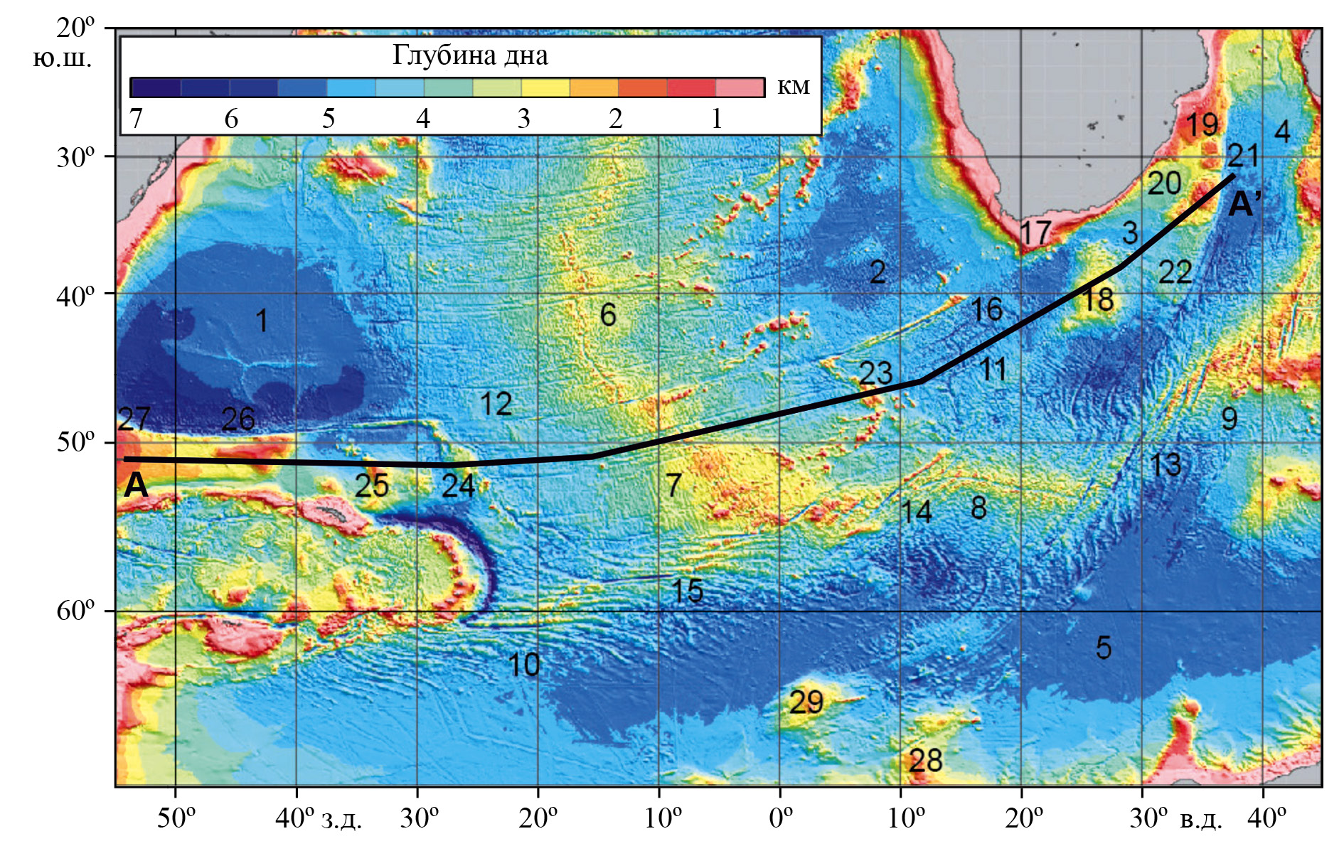 Рис. 1. Рельеф дна района исследований по данным модели GEBCO_2014 [72]. На рисунке показан профиль А-А′. Изменения рельефа дна и геофизических характеристик вдоль профиля показаны на рис. 2д–ж. Цифрами на рисунке обозначены морфоструктуры: океанические котловины: 1 – Аргентинская, 2 – Капская, 3 – Транскей, 4 – Мозамбикская, 5 – Африкано-Антарктическая; спрединговые хребты: 6 – САХ, 7 – южный сегмент САХ, 8 – западный сегмент ЮЗИХ, 9 – восточный сегмент ЮЗИХ, 10 – ААХ, 11 – палеоспрединговый хребет Агульяс; разломные зоны и трансформные разломы: 12 – Агульяс-Фолклендская, 13 – Дю-Туа — Эндрю-Бейн — Принц-Эдуард, 14 – Шака, 15 – Вулкан; краевые плато и океанические поднятия: 16 – Дискавери, 17 – банка Агульяс, 18 – плато Агульяс, 19 – Северная долина Натал, 20 – Южная долина Натал, 21 – Мозамбикский хребет, 22 – поднятие Транскей, 23 – Метеор, 24 – Айлос-Оркадос, 25 – Северо-Восточная Георгия, 26 – банка Мориса Юинга, 27 – Фолкледнское плато, 28 – хребет Астрид, 29 – поднятие Мод
