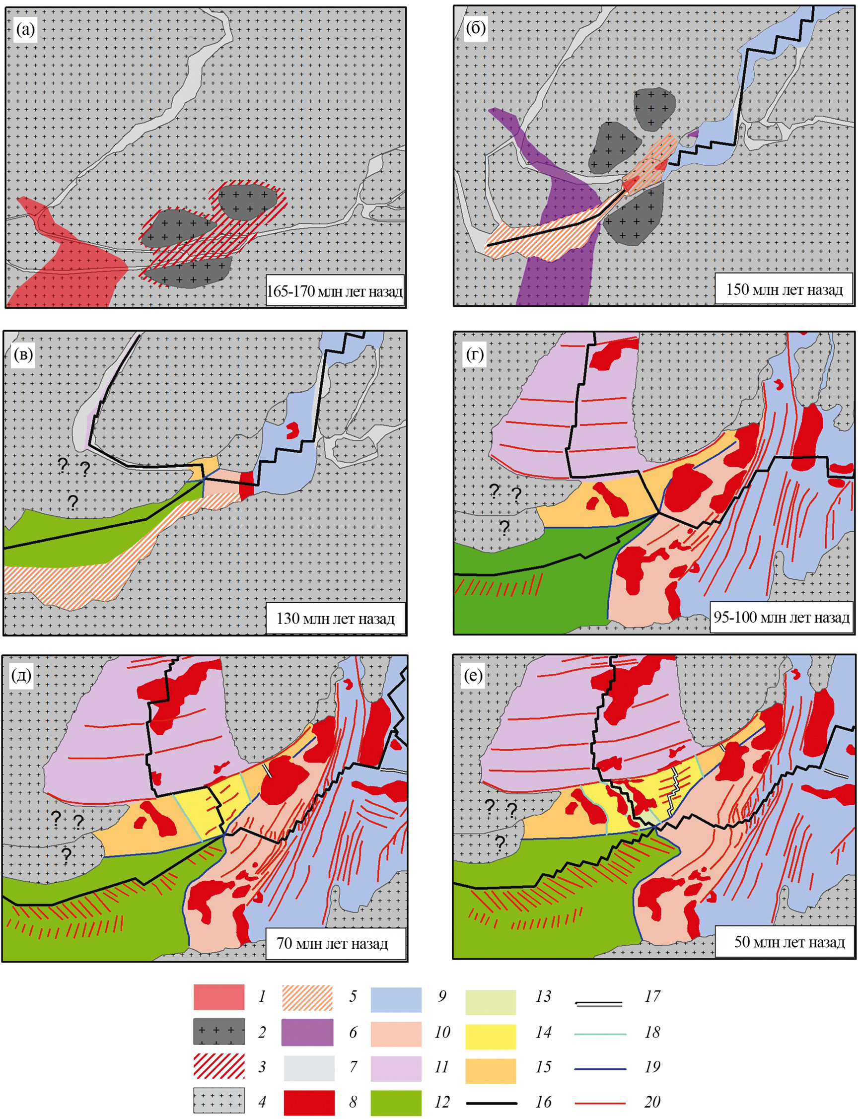 Рис. 4. Реконструкции структур района исследования по данным [47, 51, 62, 71] с изменениями и дополнениями: а — 165–170 млн лет назад, б — 150 млн лет назад, в — 130 млн лет назад, г — 95–100 млн лет назад, д — 70 млн лет назад, е — 50 млн лет назад. Цифрами обозначены: 1 – области активного рифтинга; 2 – кратоны; 3 – схематичная область развития магматизма связанного с плюмом Кару, 4 – континентальная кора, 5 – области развития SDR, 6 – отмирание рифтинга, 7 – утоненная кора, 8 – магматические поднятия, 9 – океаническая кора восточного участка ЮЗИХ и других спрединговых хребтов Индийского океана, 10 – океаническая кора западного участка ЮЗИХ, 11 – океаническая кора САХ, 12 – океаническая кора спредингового центра моря Уэдделла, 13 – океаническая кора ЮСАХ, 14 – океаническая кора плиты Мальвинес, 15 – океаническая кора спредингового центра котловины Транскей, 16 – оси спрединга, 17 – оси палеоспрединга; 18 – шовные зоны сформированные в результате перескока спрединга, 19 – псевдоразломы — следы тройного соединения Буве, 20 – внеосевые следы разломов. Знаками вопроса отмечены области с возможным развитием океанической коры [59]