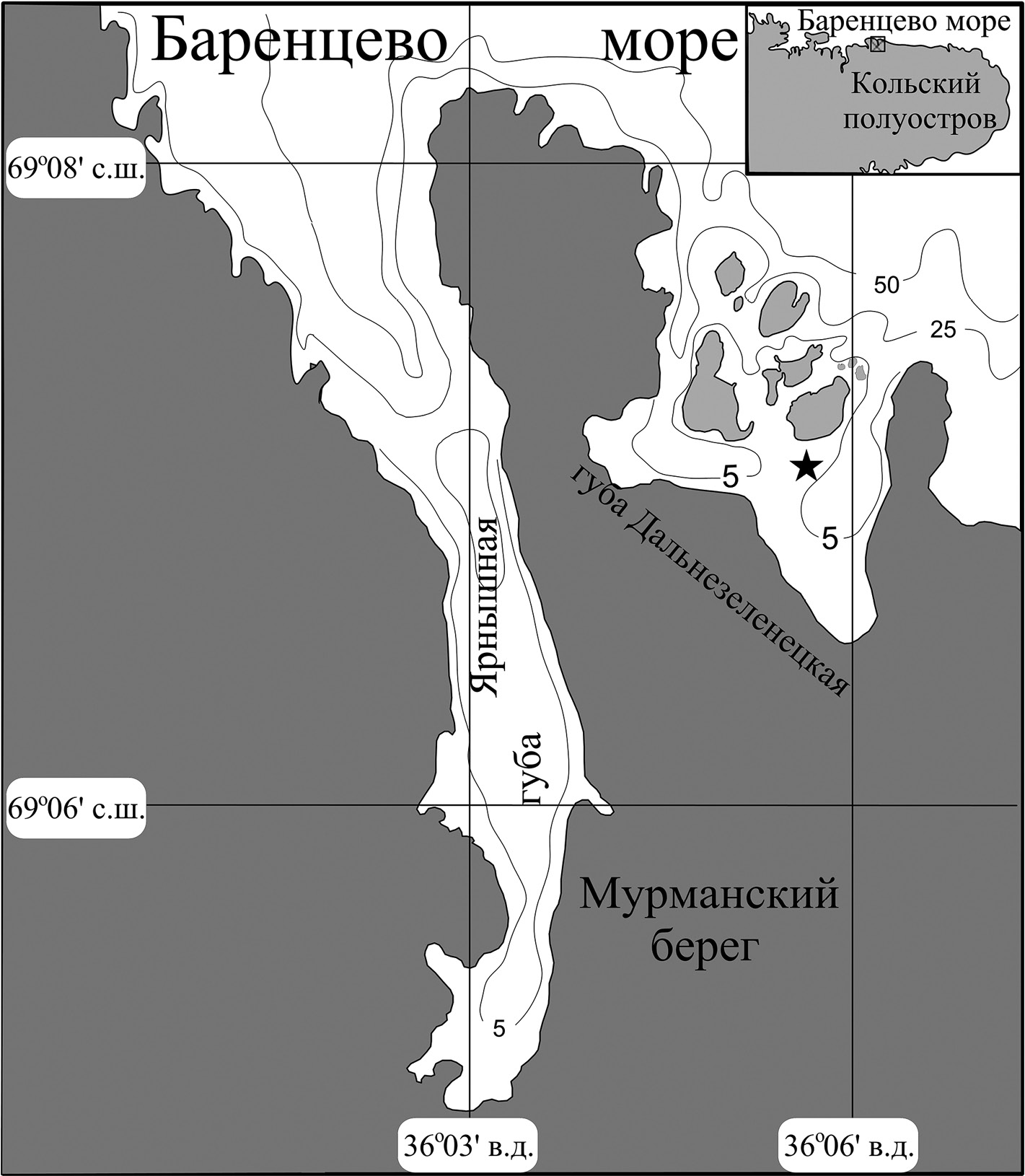 Рис. 1. Схема района исследований. Надписи на рисунке — Баренцево море, Кольский полуостров, Мурманский берег, губа Ярнышная, губа Дальнезеленецкая, с.ш. — северная широта, в.д. — восточная долгота