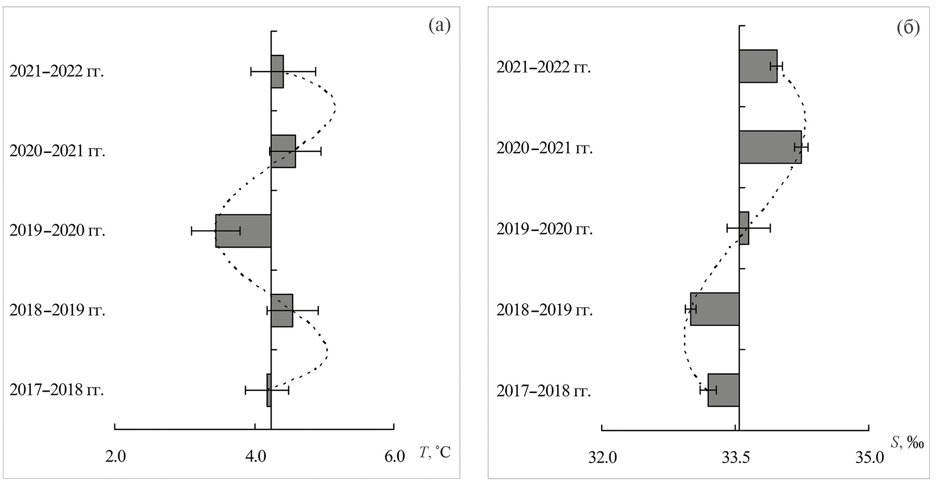 Рис. 2. Среднегодовая температура (а) и соленость (б) воды в губе Дальнезеленецкой. Пунктирная линия — полиномиальный тренд, гг. — года (период наблюдения), Т, °С — температура в градусах Цельсия, S, ‰ – соленость воды в промилях