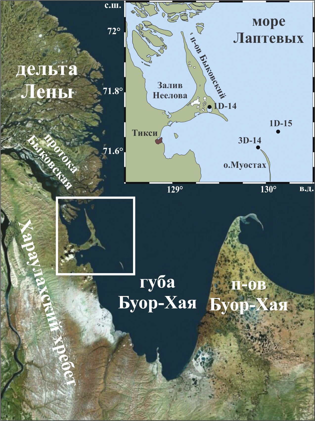 Рис. 1. Карта-схема района исследований и расположение пробуренных скважин. Надписи: дельта Лены; протока Быковская; Хараулахский хребет; губа Буор-Хая; п-ов Буор-Хая; море Лаптевых; п-ов Быковский; Залив Неелова; Тикси; о. Муостах