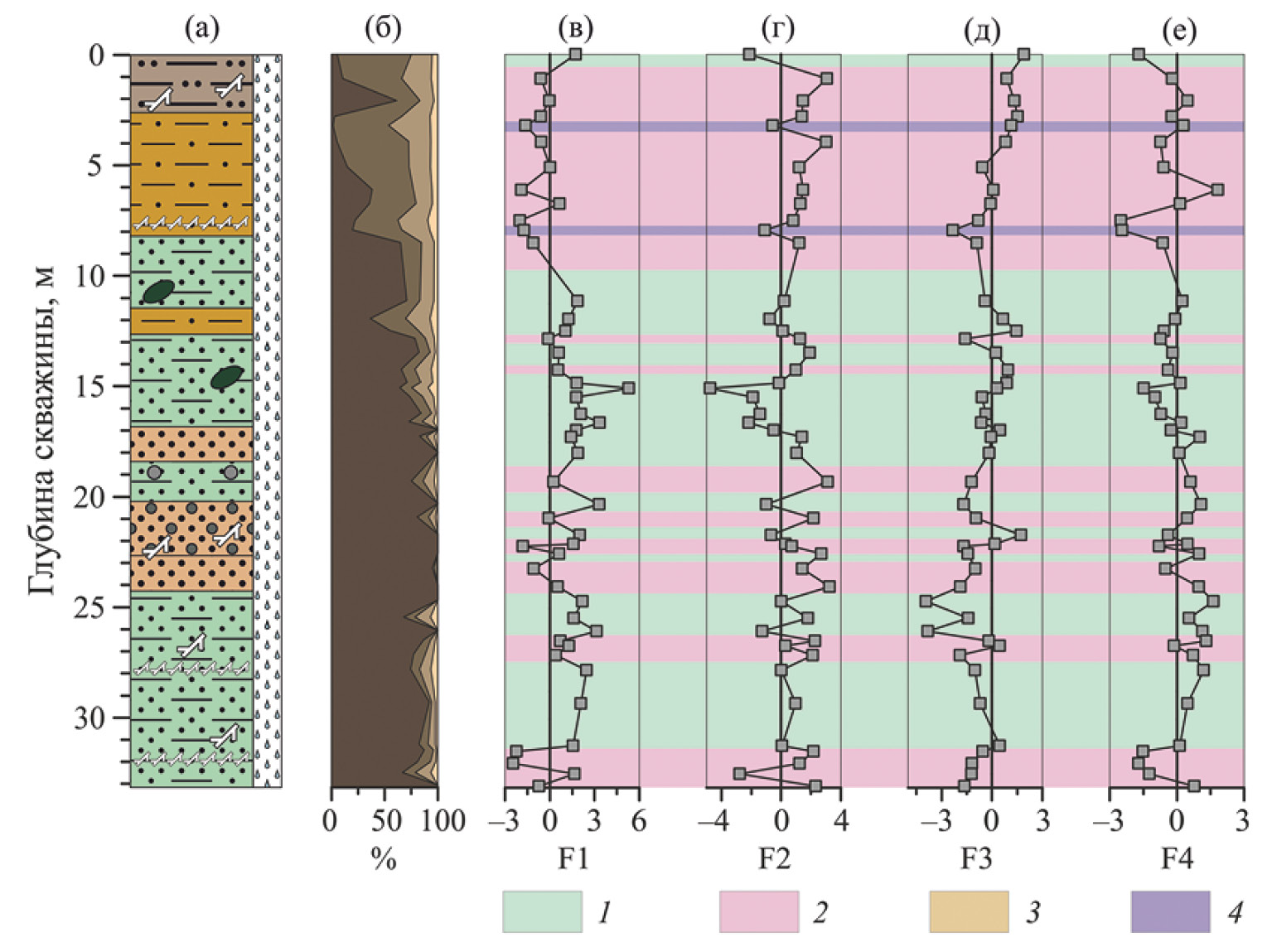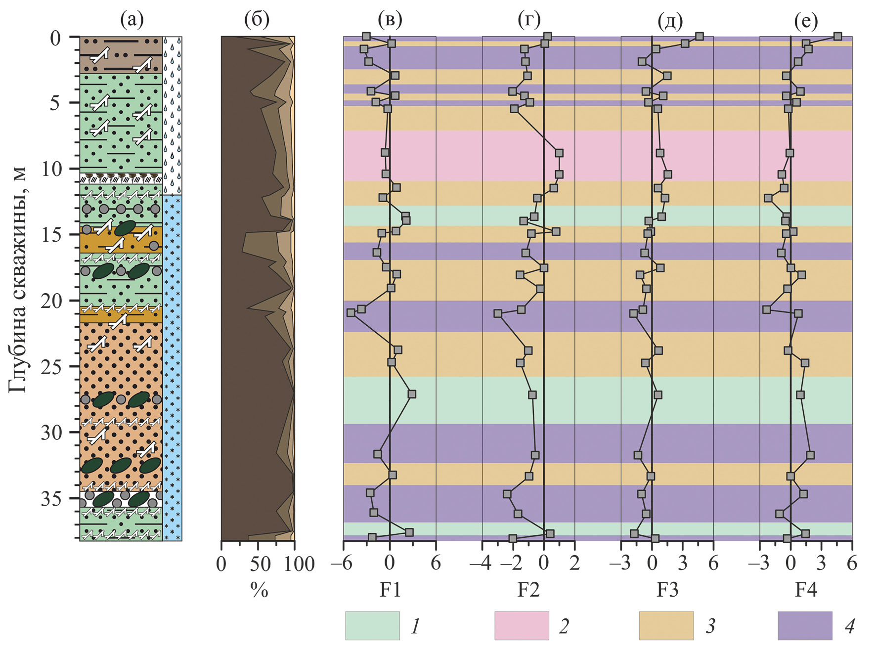 Рис. 7. Минералогическая дифференциация профиля 1D-14 по выделенным типам минеральных ассоциаций. а — литологическое описание; б — гранулометрический состав; в-е — распределение величины факторных счетов F1-F4. 1 — тип I; 2 — тип II; 3 — тип III; 4 — тип IV