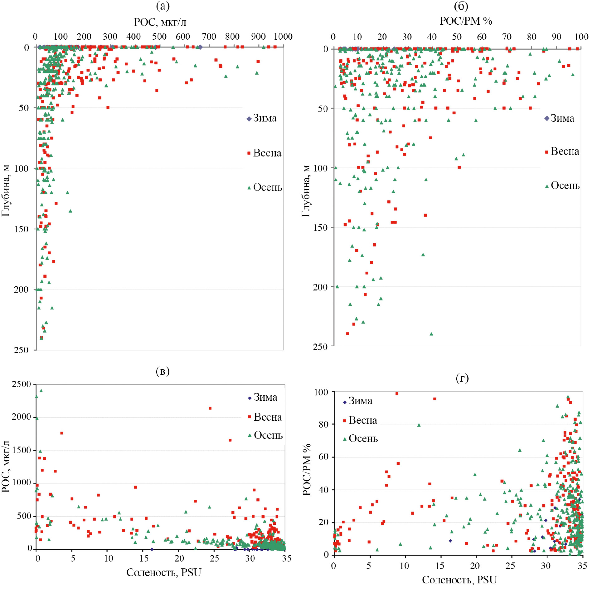 Повышенные концентрации взвешенного органического углерода наблюдаются в пресных водах речного стока (рис. 5в). После прохождения геохимического барьера его концентрации резко убывают в связи с осаждением взвеси. Однако в водах высокой солености снова фиксируется их рост, связанный с поставками новообразованного органического вещества. Особенно ярко данная тенденция выражена для весеннего периода. В зимний период концентрации POC низки во всем диапазоне солености.
