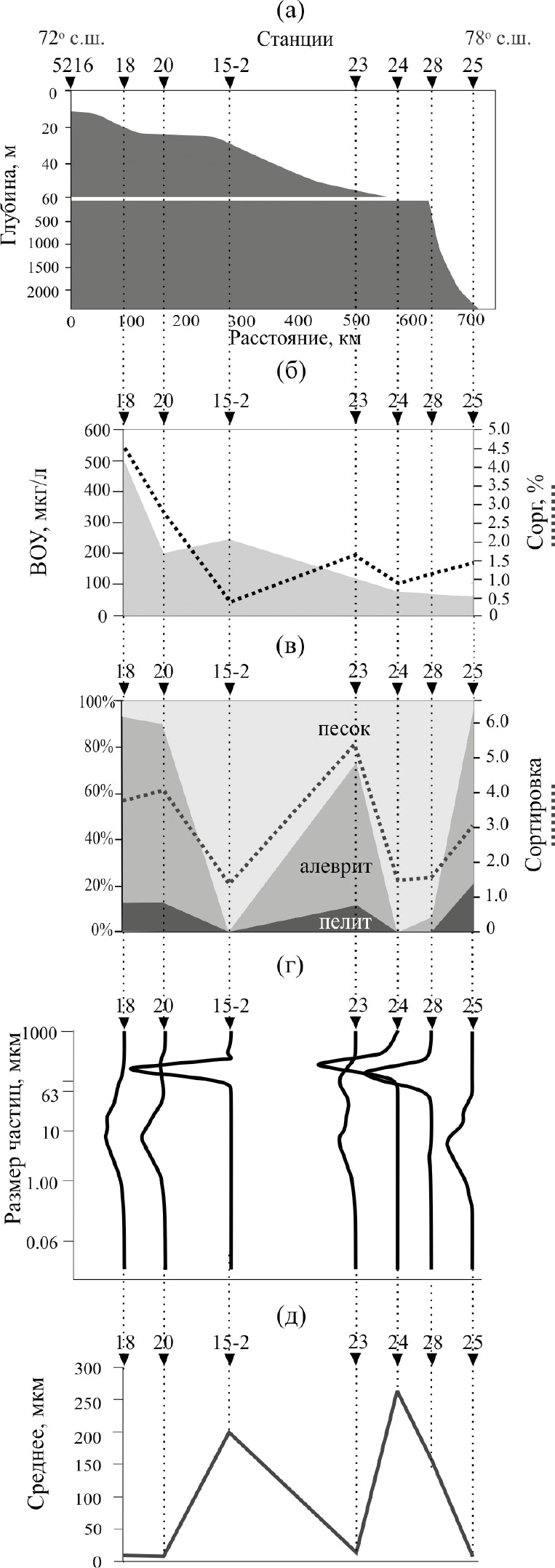В составе осадков ст. 5218 и ст. 5220 преобладает плохо сортированный алеврит (коэффициент сортировки 3.7–4.0) с примесью пелита и песка (рис. 3в, 4а). Распределения размеров частиц демонстрируют бимодальный характер (моды 8.55 и 20.3 мкм; 8.55 и 230 мкм, соответственно) при среднем размере частиц 10.6 и 9.08 мкм (рис. 3д). На ст. 5215-2 осадки представлены хорошо сортированным песком (коэф. сортировки 1.28, мономодальное распределение) со средним размером частиц 155 мкм. При движении на север пески сменяются пелитово-алевритовыми илами с содержанием фракции <63 мкм, превышающим 80%, согласно [28] (рис. 3в, 4б). Вблизи бровки шельфа (ст. 5223) осадки сложены плохо сортированным песчанистым алевритом (коэф. сортировки 5.35) с примесью пелита (табл. 4, рис. 3в, 4б). Распределение размеров частиц приобретает полимодальный характер со средним значением 14.1 мкм (рис. 3 г, д). В составе поверхностных осадков на внешнем крае шельфа (ст. 5224, 5228) вновь отмечается преобладание хорошо сортированного песка со средним размером 189 и 122 мкм, соответственно. Это, вероятно, связано с вымыванием (неотложением) пелита и мелкого алеврита под действием активных гидродинамических процессов. На континентальном склоне (ст. 5225) (в соответствии с принципом циркумконтинентальной зональности) с увеличением глубины и расстояния от берега осадки становятся более тонкозернистыми, содержание песка снижается до 0%, средний размер зерен уменьшается до 5.17 мкм при коэффициенте сортировки 2.96 (табл. 4, рис. 3в–д, 4б). Распределение размеров частиц становится бимодальным (4.34 и 24.2 мкм).