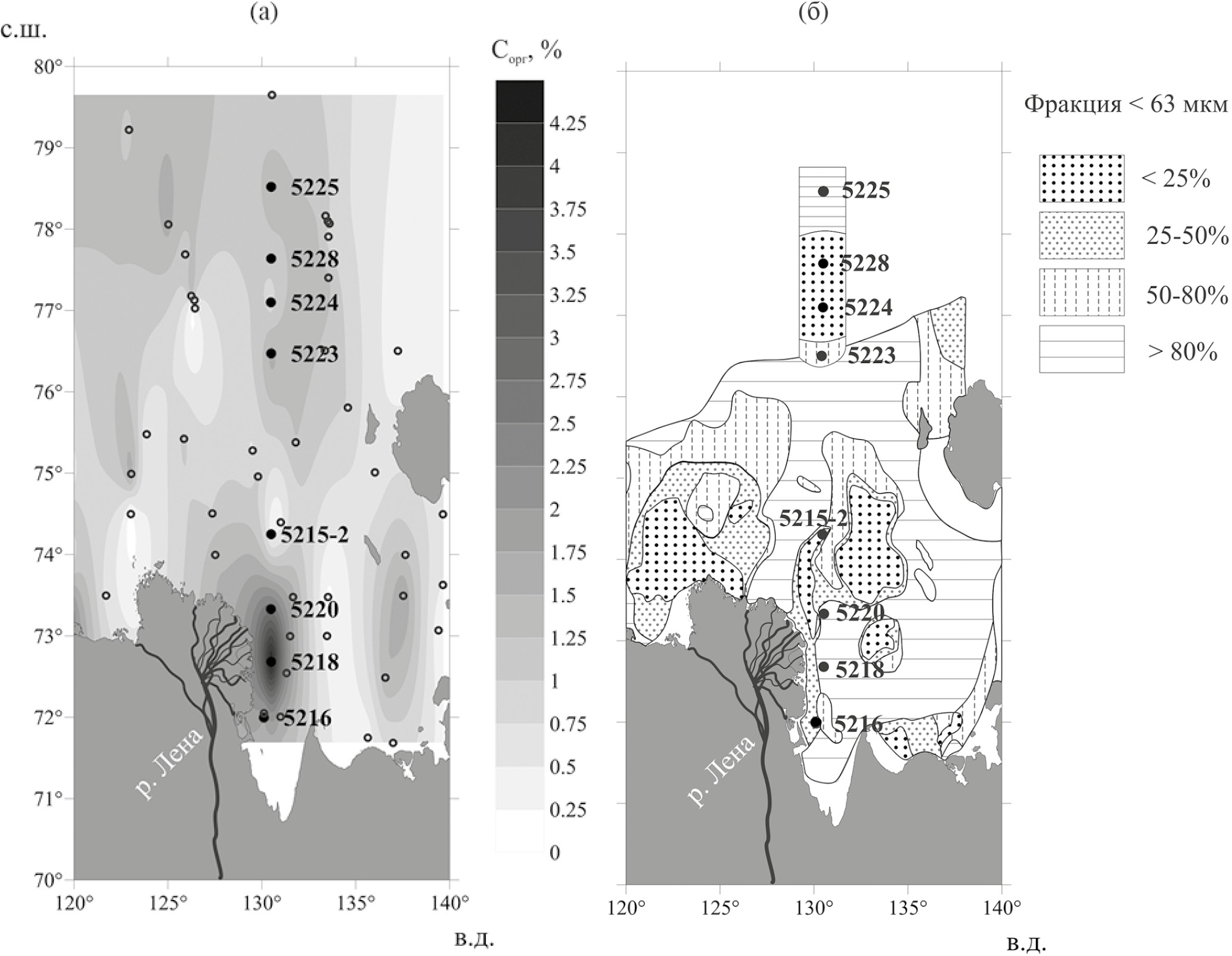 Органическое вещество донных отложений. На изученном разрезе процентное содержание Сорг в поверхностном слое осадков колеблется от 0.38% (мелкозернистые пески) до 4.40% (алеврит). Наиболее высокие концентрации Сорг характерны для осадков зоны стока вод р. Лены (табл. 3, рис. 3б, 4а).