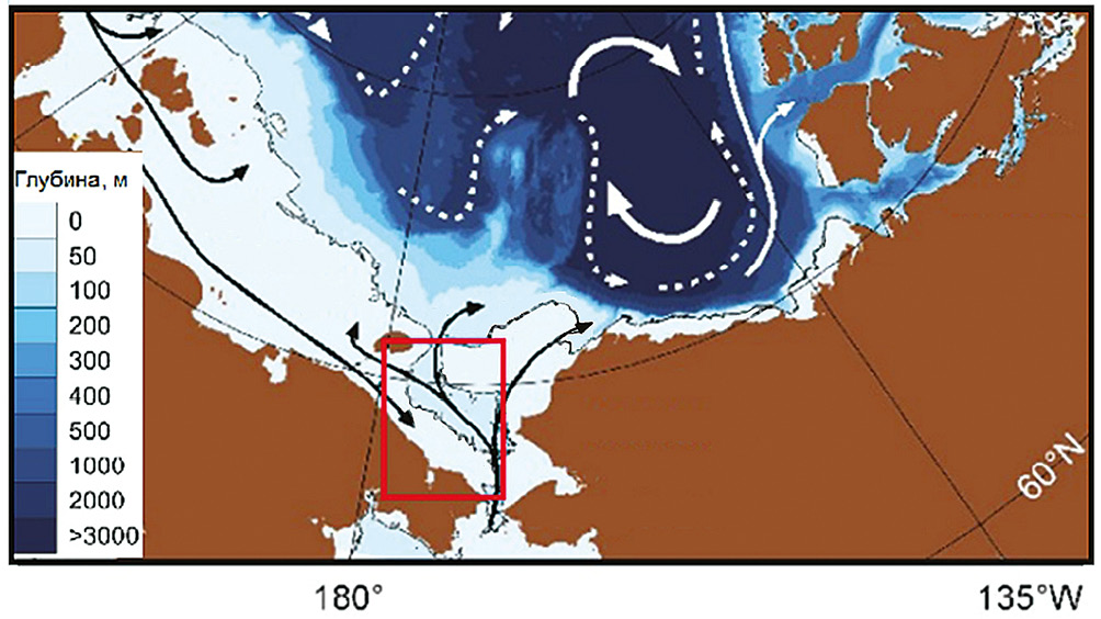 Объём воды, поступающей из Тихого океана в Чукотское море, многократно меньше объёмов, приносимых в моря западной Арктики Северо-Атлантическим течением, продолжением Гольфстрима. До последнего времени среднегодовой расход через Берингов пролив (направленный на север) оценивался величиной около 0.8 Св, в 2010-е годы он вырос до 1.0 Св [11]. Это меньше летнего расхода в 1.1–1.3 Св в близком по размерениям проливе Лаперуза, через который субтропические воды вторгаются в Охотское море, образуя тёплое течение Соя [6]. Однако следует учесть, что северная Пацифика и, в частности, Берингово море, отличаются самыми высокими в мире концентрациями биогенных веществ в глубинном слое, поскольку эти акватории находятся в конце глобального “океанского конвейера” глубинных вод и в них аккумулируются продукты регенерации минеральных форм биогенных элементов со всей его тысячекилометровой “ленты”, протянувшейся через Атлантический, Индийский и Тихий океаны. На пути к Берингову проливу поверхностные и подповерхностные беринговоморские воды обогащаются биогенными веществами из глубинных слоёв в процессе приливного перемешивания в Алеутских проливах, вдоль кромки восточноберинговоморского шельфа, в Анадырском проливе, при апвеллингах у берегов Чукотки, и наконец во время прохождения самого пролива, в западной части которого также происходит подъём вод [14]. Немаловажно и то, что большая часть стока крупнейшей реки, впадающей в Берингово море – Юкона, в том числе ионного стока, также выносится в Берингов пролив и далее в Чукотское море [12]. Благодаря адвекции беринговоморских вод, прилегающие к проливу воды Чукотского моря летом заметно “живее” других арктических районов, здесь выше биомасса зоопланктона и нектона, сюда из Берингова моря заходят на нагул косяки рыбы и морские млекопитающие [3, 20].