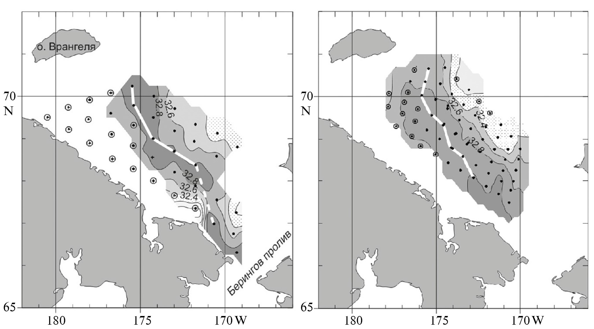 Поток беринговоморских вод в Чукотском море хорошо прослеживается в поле средней солёности подповерхностного слоя, как область повышенных значений. В разные годы исследований эта область существенно различалась по размерам, форме и величинам солёности, но общее направление потока оставалось неизменным – на северо-запад, в направлении о. Врангеля, далее с поворотом на север, в широкий пролив между островами Врангеля и Геральд, имеющий глубоководный желоб (см. рис. 1, 2). В поверхностном слое поток беринговоморских вод не выражен столь отчётливо (на рисунках не показан), поскольку этот слой имеет небольшую толщину (не больше 20 м, часто несколько метров) и поэтому его характеристики слишком изменчивы.