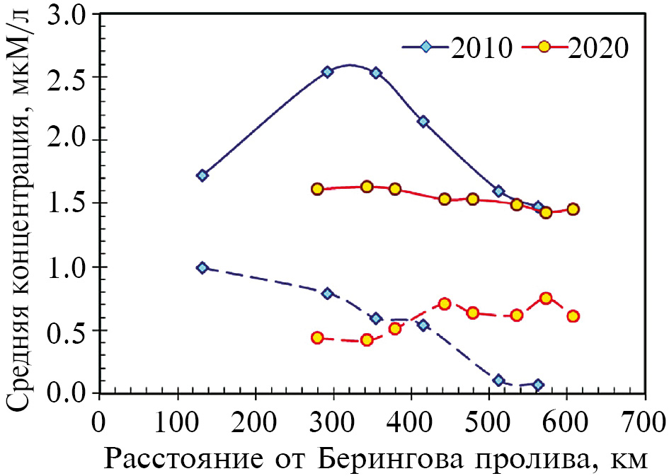 По мере удаления от Берингова пролива и смешения с окружающими водами показатели беринговоморских вод постепенно отдаляются от изначальных экстремальных для Чукотского моря величин, в частности, их солёность снижается, при этом толщина поверхностного слоя возрастает от 4–5 м до примерно 21–23 м, а толщина подповерхностного слоя уменьшается, как за счёт развития поверхностного слоя, так и из-за появления у дна местных подповерхностных арктических вод. При приближении к о. Врангеля, полностью окружённому холодными арктическими водами, с поворотом на север, толщина поверхностного слоя вновь немного уменьшается, до 18–19 м. Концентрация фосфора в потоке по мере удаления от пролива снижается, но по-разному (рис. 4). В 2010 г. она была изначально высокой (свыше 1.0 мкмоль/л) и на дистанции до 300–400 км от пролива быстро уменьшалась в поверхностном слое, при этом росла в подповерхностном слое, что интерпретировано как признаки бурного развития фитопланктона в верхнем слое моря и деструкции органического вещества у дна. На большем расстоянии от пролива фосфор в поверхностном слое был почти исчерпан (до 0.1 мкмоль/л и менее), в подповерхностном слое его концентрация тоже убывала. В 2020 г. концентрация фосфора по мере удаления от пролива медленно уменьшалась в подповерхностном слое (от 1.6 до 1.4 кмоль/л) и росла в поверхностном слое (от 0.4 до 0.7 мкмоль/л), т. е. консервативная динамика преобладала над продукционной.
