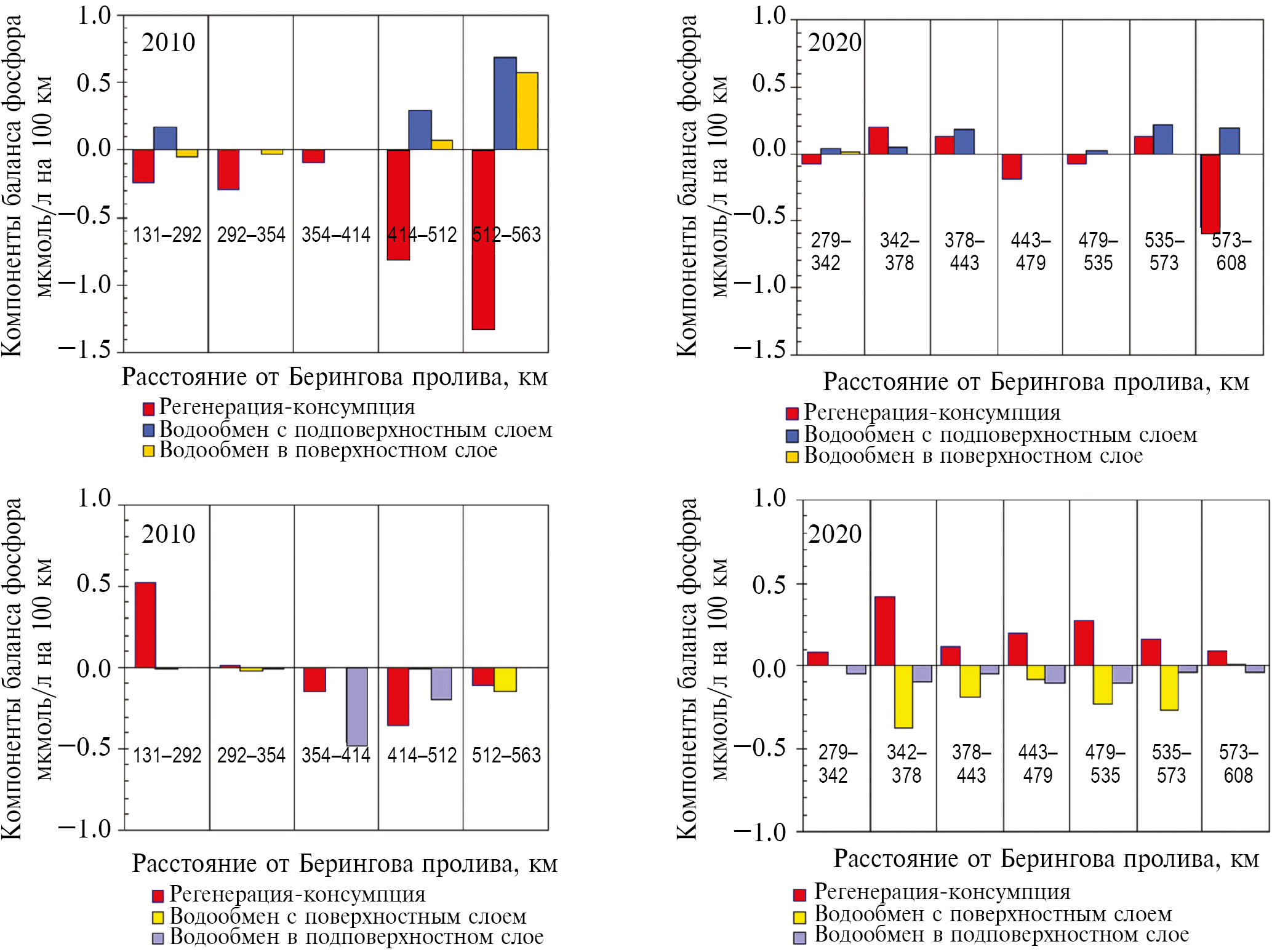 Рис. 5. Динамика компонент баланса минерального фосфора в поверхностном (вверху) и подповерхностном (внизу) слоях потока беринговоморских вод по мере удаления от Берингова пролива летом 2010 и 2020 гг.